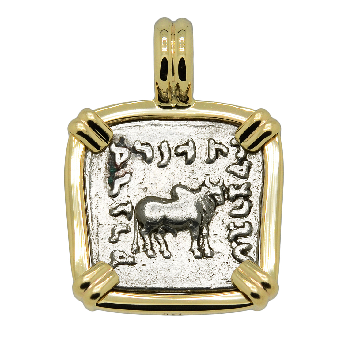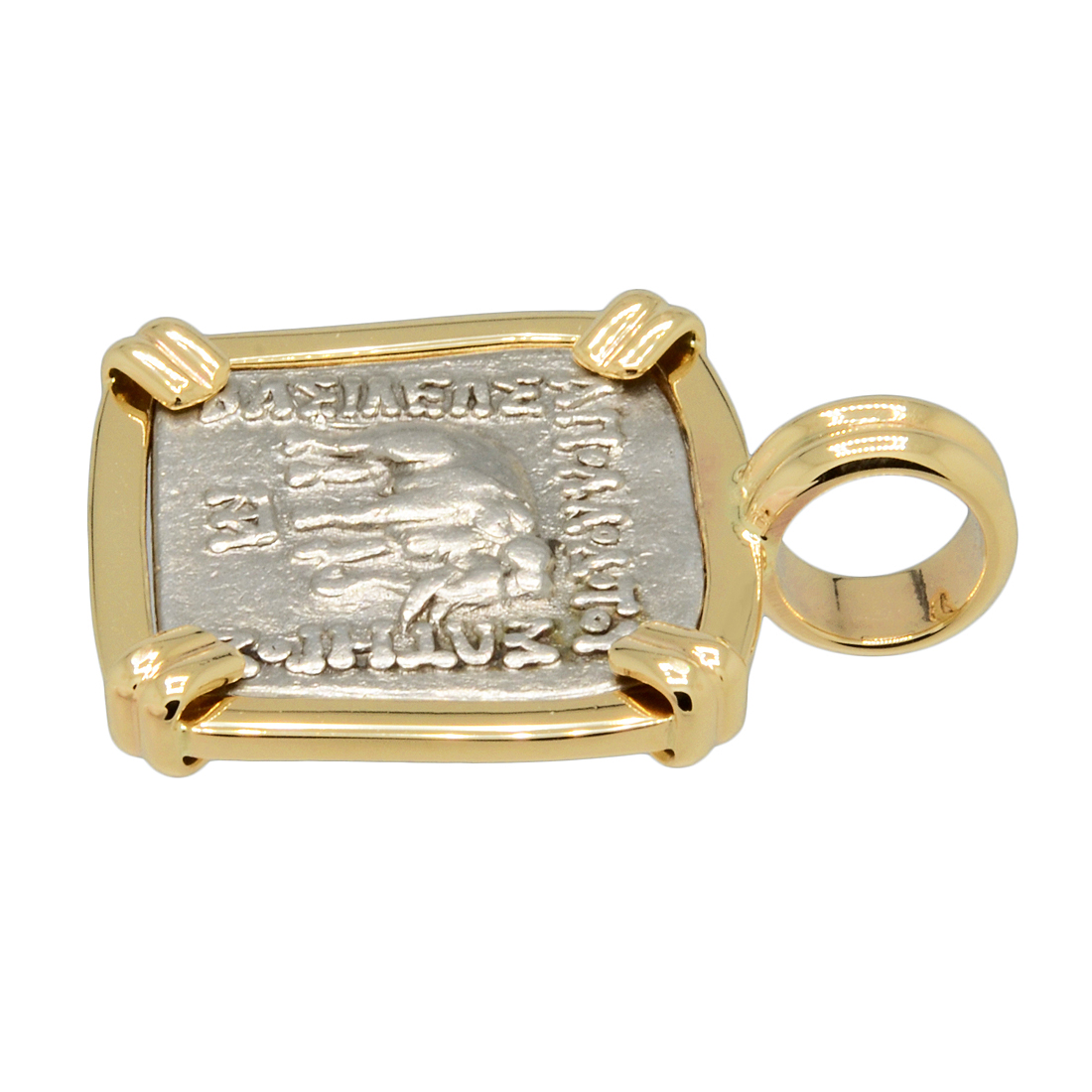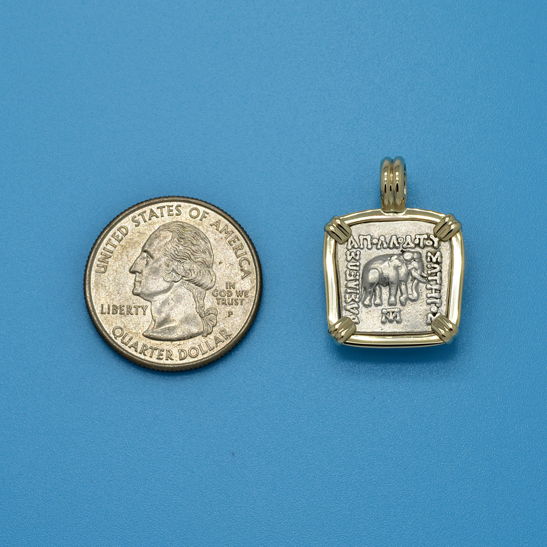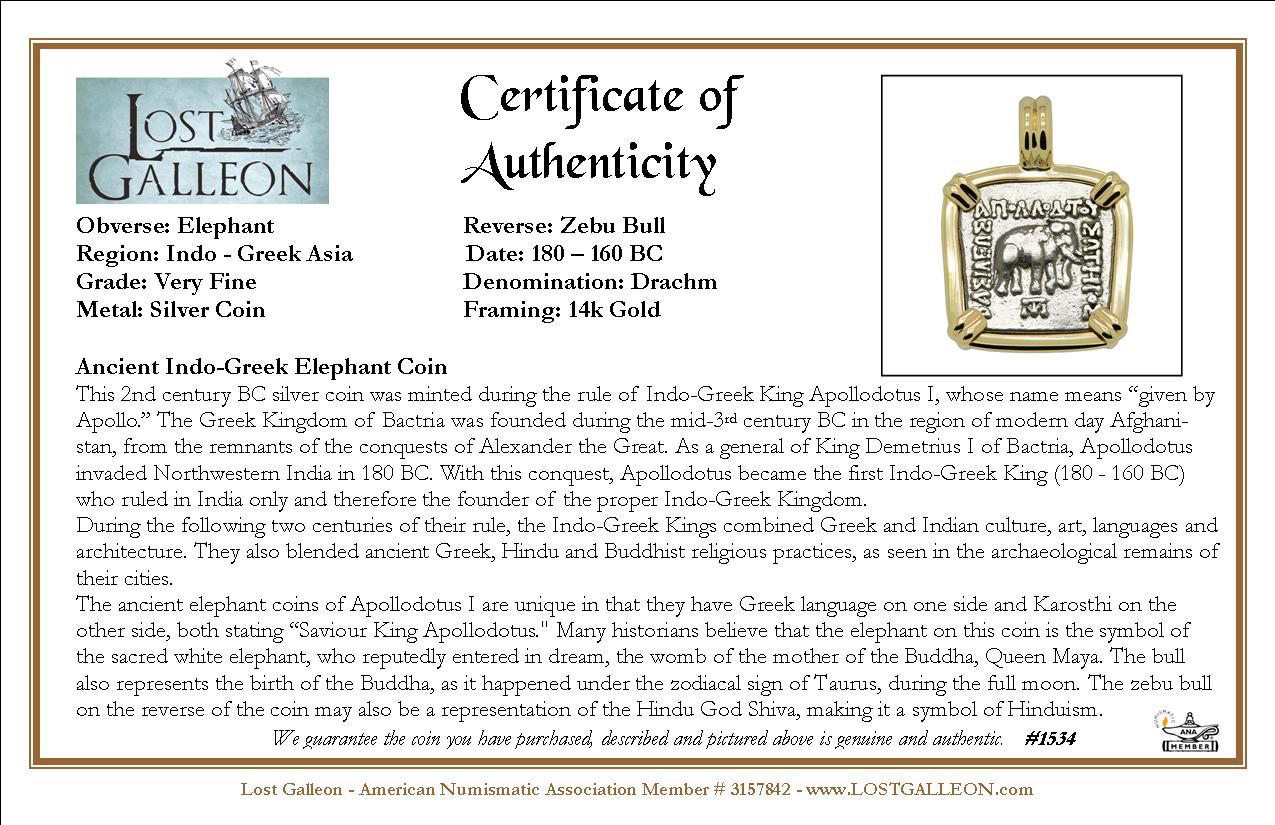 The ancient elephant coins of Apollodotus I are unique in that they have Greek language on one side and Karosthi on the other side, both stating “Saviour King Apollodotus." Many historians believe that the elephant on this coin is the symbol of the sacred white elephant, who reputedly entered in dream, the womb of the mother of the Buddha, Queen Maya. The bull also represents the birth of the Buddha, as it happened under the zodiacal sign of Taurus, during the full moon. The zebu bull on the reverse of the coin may also be a representation of the Hindu God Shiva, making it a symbol of Hinduism.