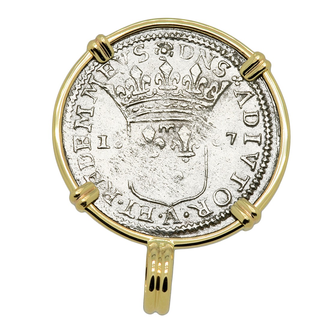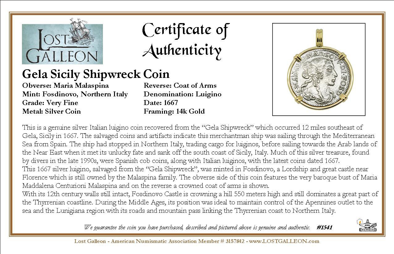 This is a genuine silver Italian luigino coin recovered from the “Gela Shipwreck” which occurred 12 miles southeast of Gela, Sicily in 1667. The salvaged coins and artifacts indicate this merchantman ship was sailing through the Mediterranean Sea from Spain. The ship had stopped in Northern Italy, trading cargo for luiginos, before sailing towards the Arab lands of the Near East when it met its unlucky fate and sank off the south coast of Sicily, Italy. Much of this silver treasure, found by divers in the late 1990s, were Spanish cob coins, along with Italian luiginos, with the latest coins dated 1667.
