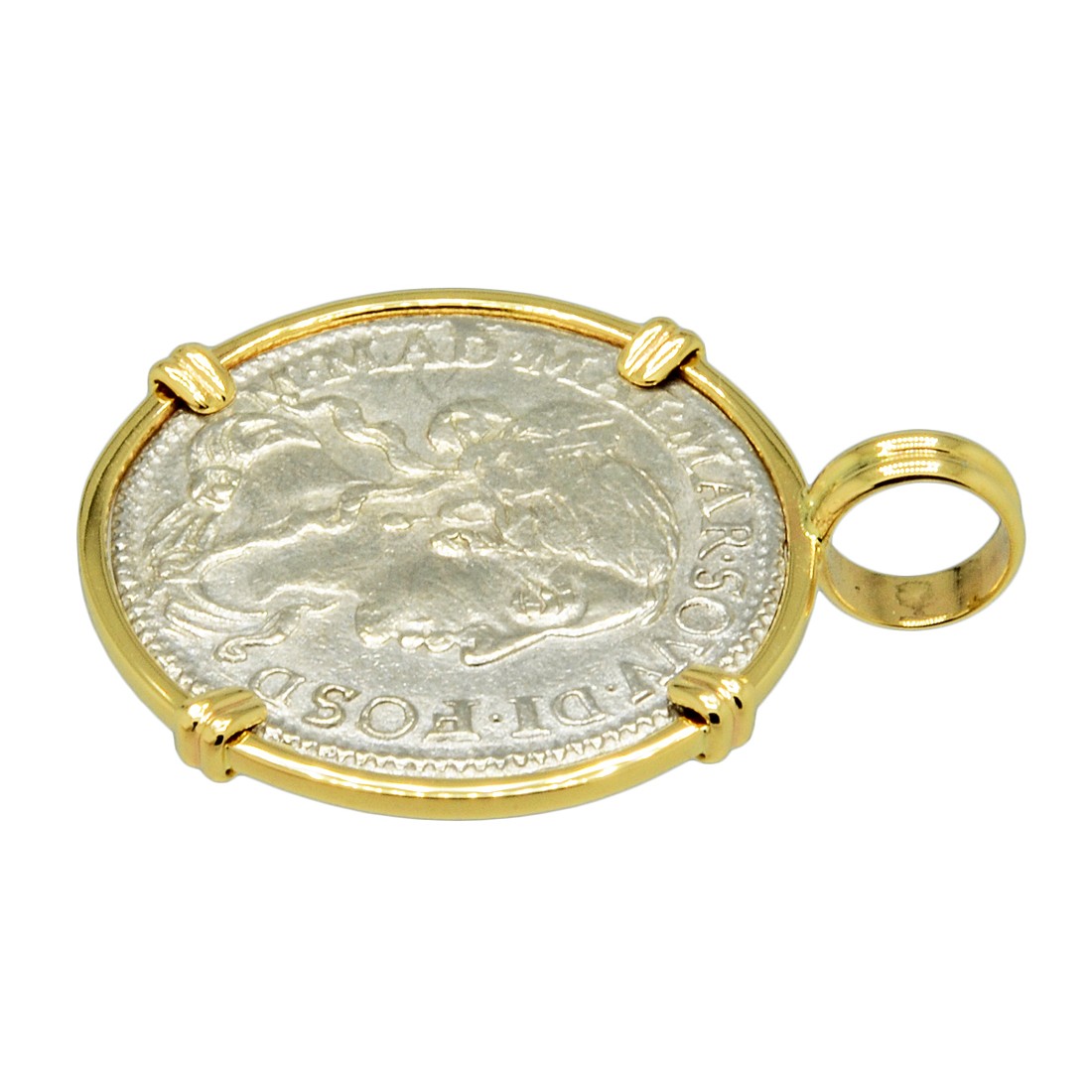 This 1667 silver luigino, salvaged from the “Gela Shipwreck”, was minted in Fosdinovo, a Lordship and great castle near Florence which is still owned by the Malaspina family. The obverse side of this coin features the very baroque bust of Maria Maddalena Centurioni Malaspina and on the reverse a crowned coat of arms is shown.