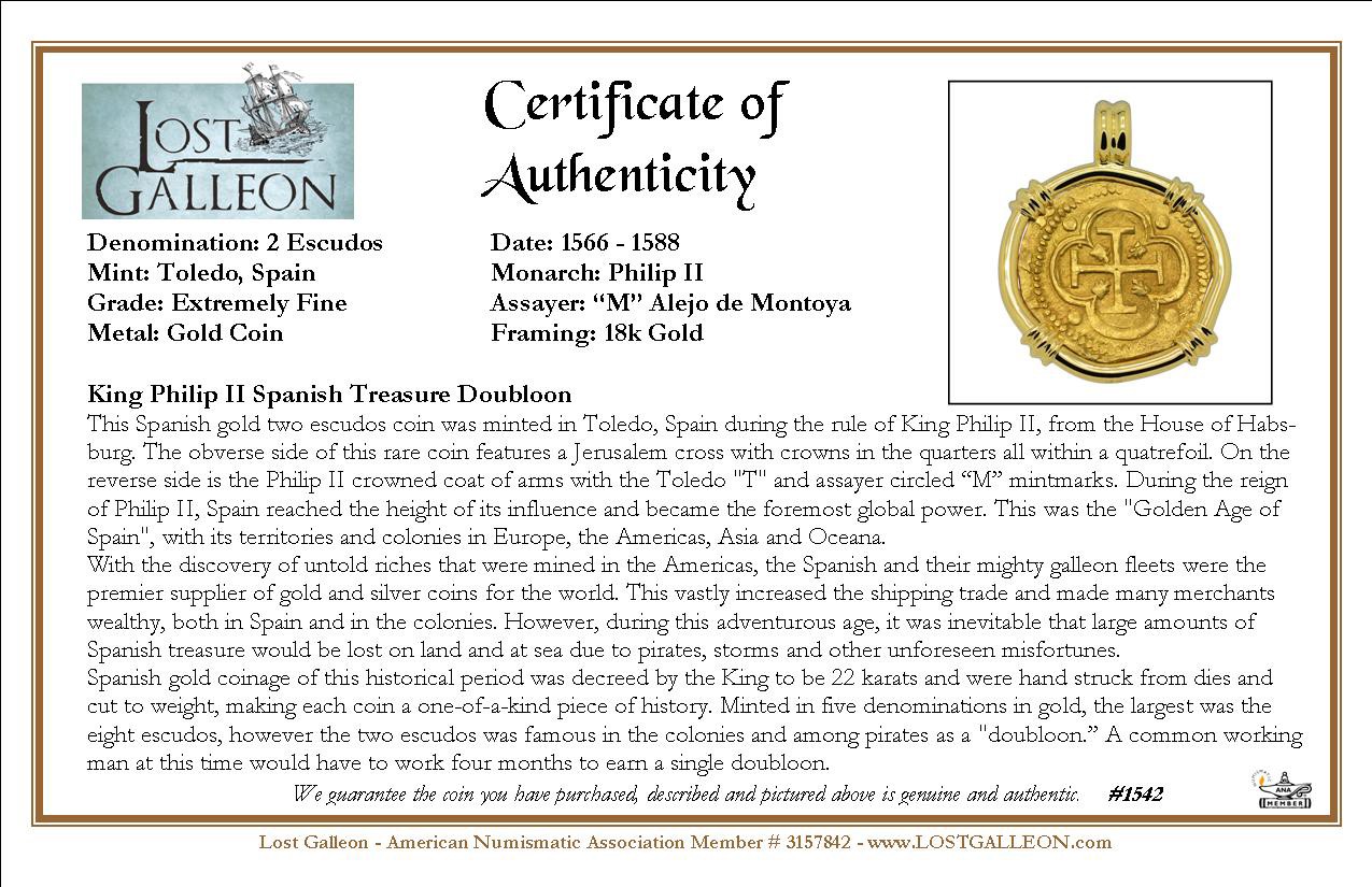 This Spanish gold two escudos coin was minted in Toledo, Spain during the rule of King Philip II, from the House of Habsburg. The obverse side of this rare coin features a Jerusalem cross with crowns in the quarters all within a quatrefoil. On the reverse side is the Philip II crowned coat of arms with the Toledo "T" and assayer circled “M” mintmarks. During the reign of Philip II, Spain reached the height of its influence and became the foremost global power. This was the "Golden Age of Spain", with its territories and colonies in Europe, the Americas, Asia and Oceana.