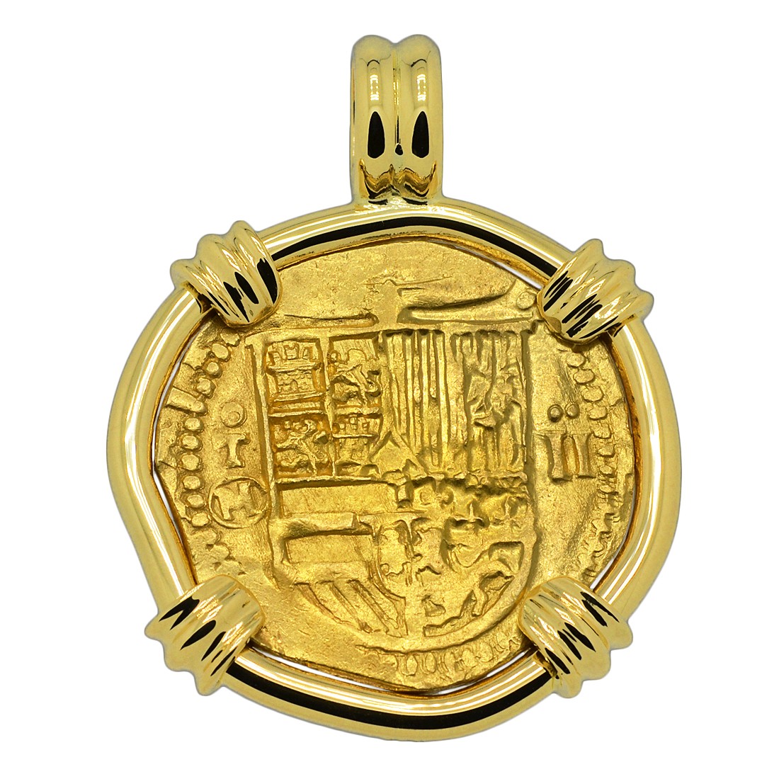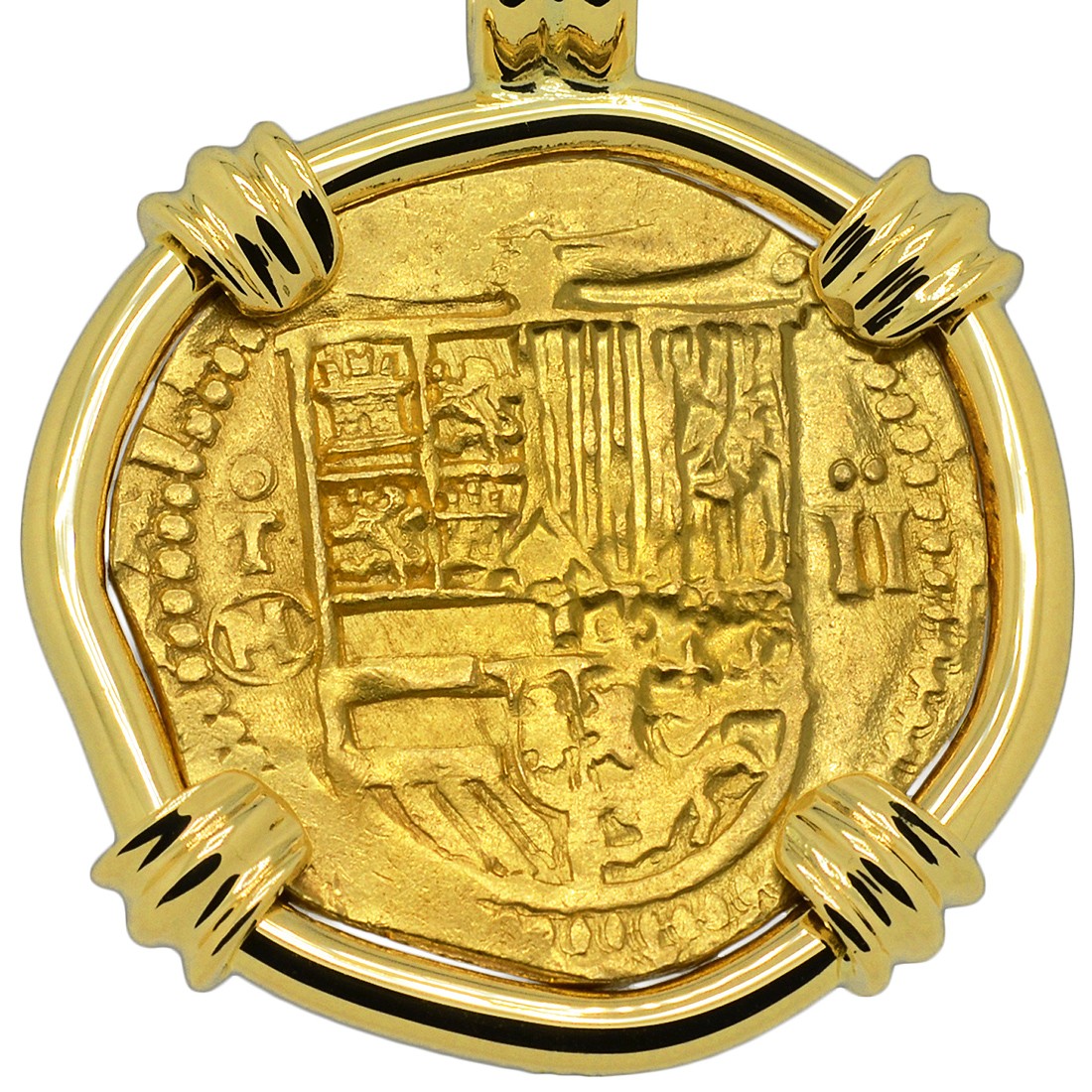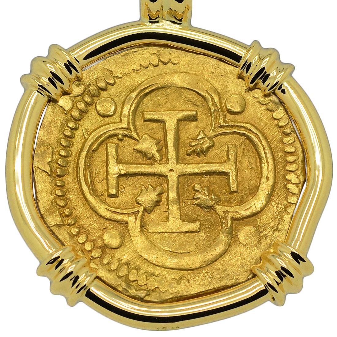 Spanish gold coinage of this historical period was decreed by the King to be 22 karats and were hand struck from dies and cut to weight, making each coin a one-of-a-kind piece of history. Minted in five denominations in gold, the largest was the eight escudos, however the two escudos was famous in the colonies and among pirates as a "doubloon.” A common working man at this time would have to work four months to earn a single doubloon.
