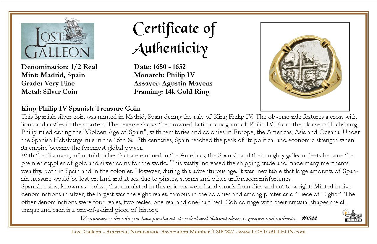 This Spanish silver coin was minted in Madrid, Spain during the rule of King Philip IV. The obverse side features a cross with lions and castles in the quarters. The reverse shows the crowned Latin monogram of Philip IV. From the House of Habsburg, Philip ruled during the "Golden Age of Spain", with territories and colonies in Europe, the Americas, Asia and Oceana. Under the Spanish Habsburgs rule in the 16th & 17th centuries, Spain reached the peak of its political and economic strength when its empire became the foremost global power.