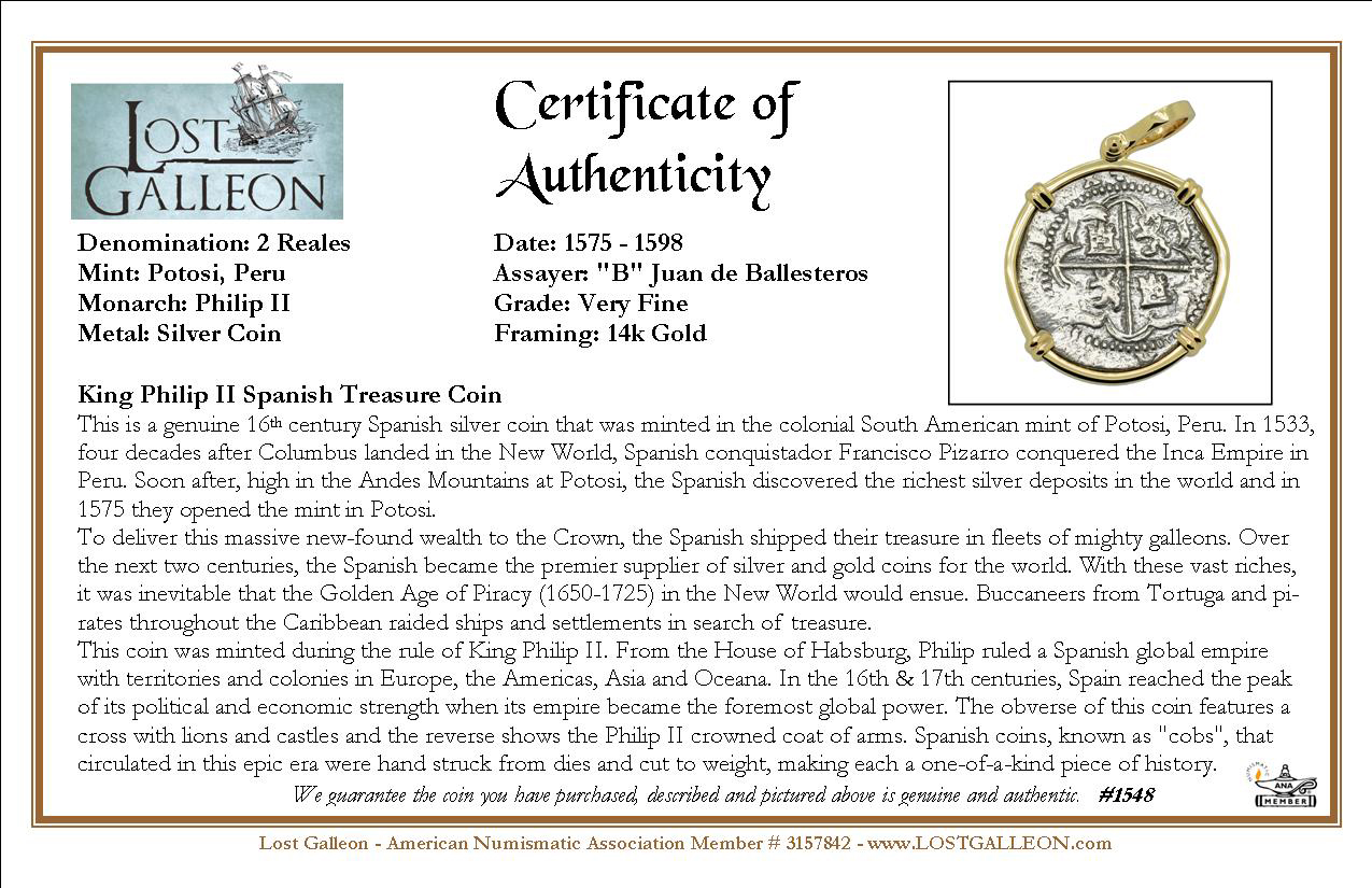This coin was minted during the rule of King Philip II. From the House of Habsburg, Philip ruled a Spanish global empire with territories and colonies in Europe, the Americas, Asia and Oceana. In the 16th & 17th centuries, Spain reached the peak of its political and economic strength when its empire became the foremost global power. The obverse of this coin features a cross with lions and castles and the reverse shows the Philip II crowned coat of arms. Spanish coins, known as "cobs", that circulated in this epic era were hand struck from dies and cut to weight, making each a one-of-a-kind piece of history.