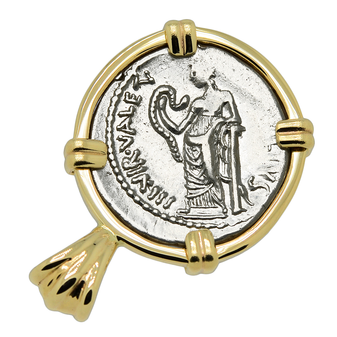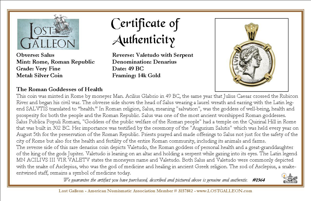 The reverse side of this rare denarius coin depicts Valetudo, the Roman goddess of personal health and a great-granddaughter of the king of the gods Jupiter. Valetudo is leaning on an altar and holding a serpent while gazing into its eyes. The Latin legend MN ACILIVS III VIR VALETV states the moneyers name and Valetudo. Both Salus and Valetudo were commonly depicted with the snake of Asclepius, who was the god of medicine and healing in ancient Greek religion. The rod of Asclepius, a snake-entwined staff, remains a symbol of medicine today.