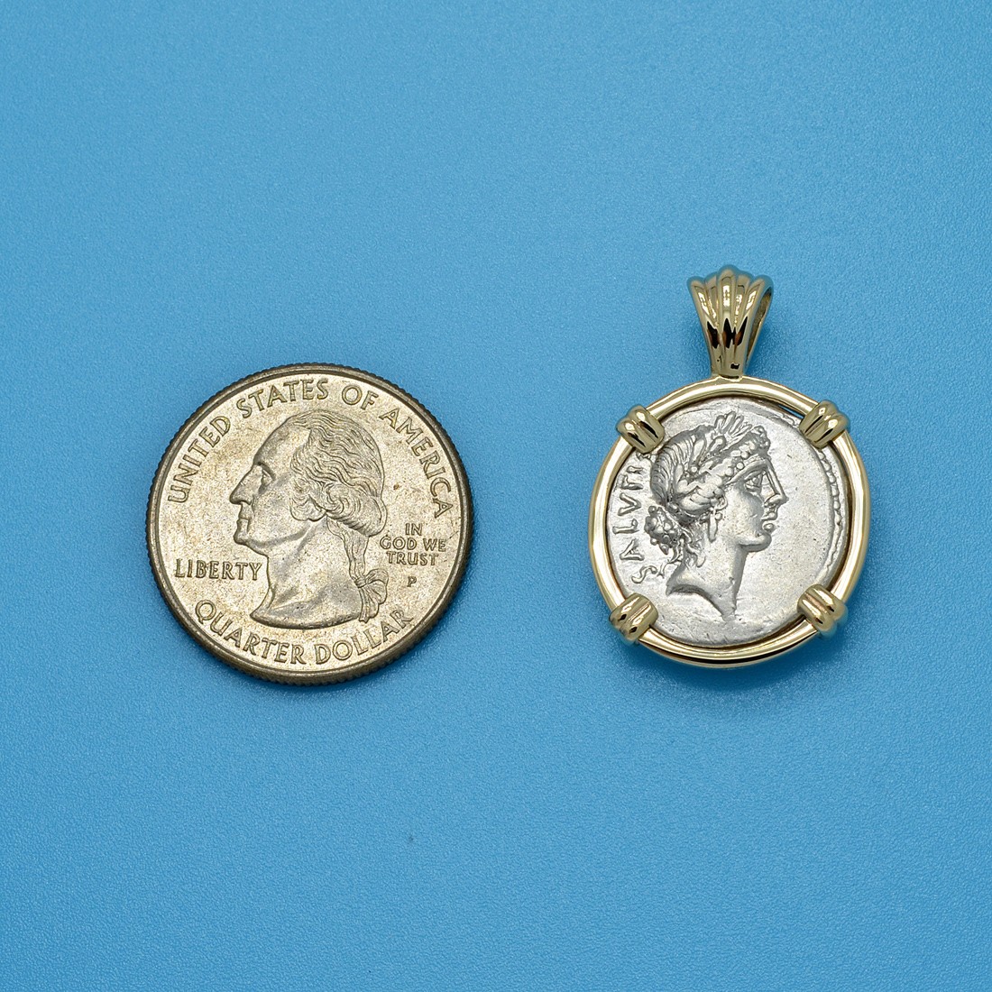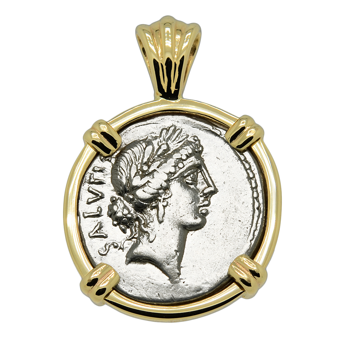 This coin was minted in Rome by moneyer Man. Acilius Glabrio in 49 BC, the same year that Julius Caesar crossed the Rubicon River and began his civil war. The obverse side shows the head of Salus wearing a laurel wreath and earring with the Latin legend SALVTIS translated to “health.” In Roman religion, Salus, meaning "salvation", was the goddess of well-being, health and prosperity for both the people and the Roman Republic.