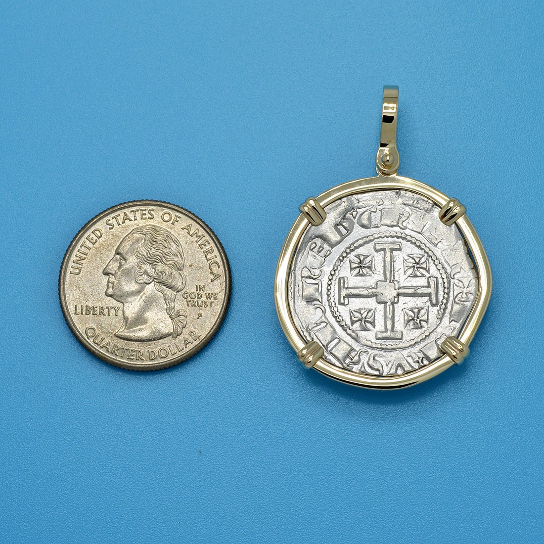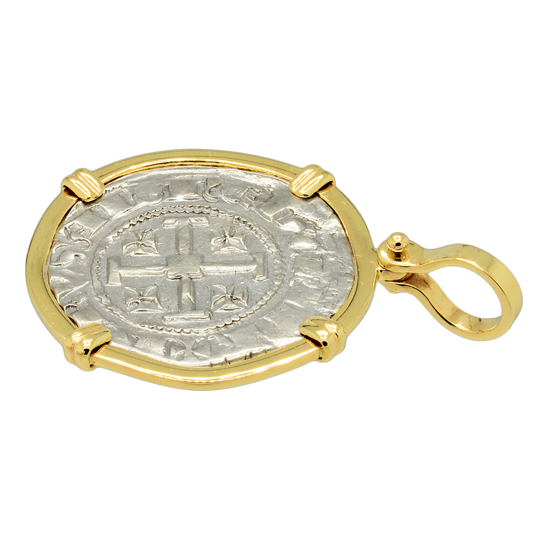 On this silver gros coin, King Hugh IV is seated while holding a fleur-de-lis tipped scepter and globus cruciger, which was a Christian symbol of authority during the Medieval Period. The obverse shows a Jerusalem cross, also known as the Crusader Cross, which is a large cross potent with four smaller Greek crosses in each quadrant.