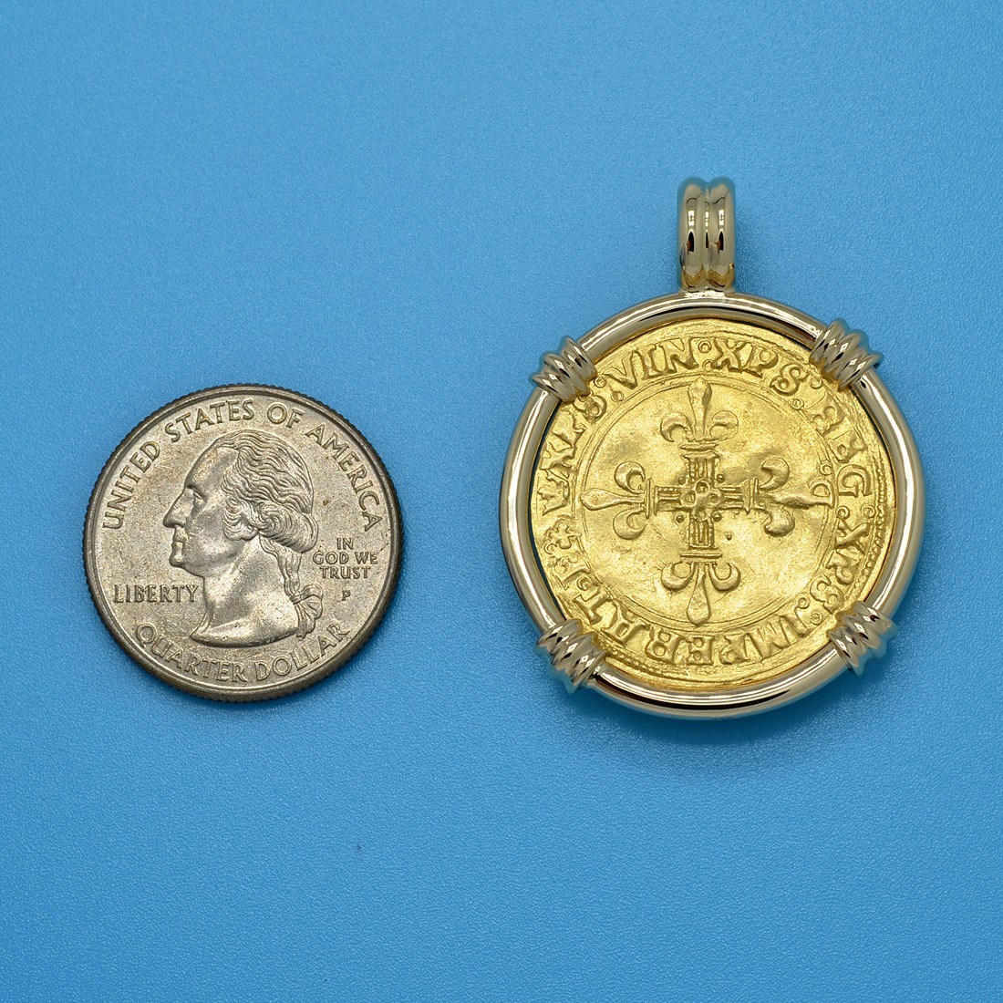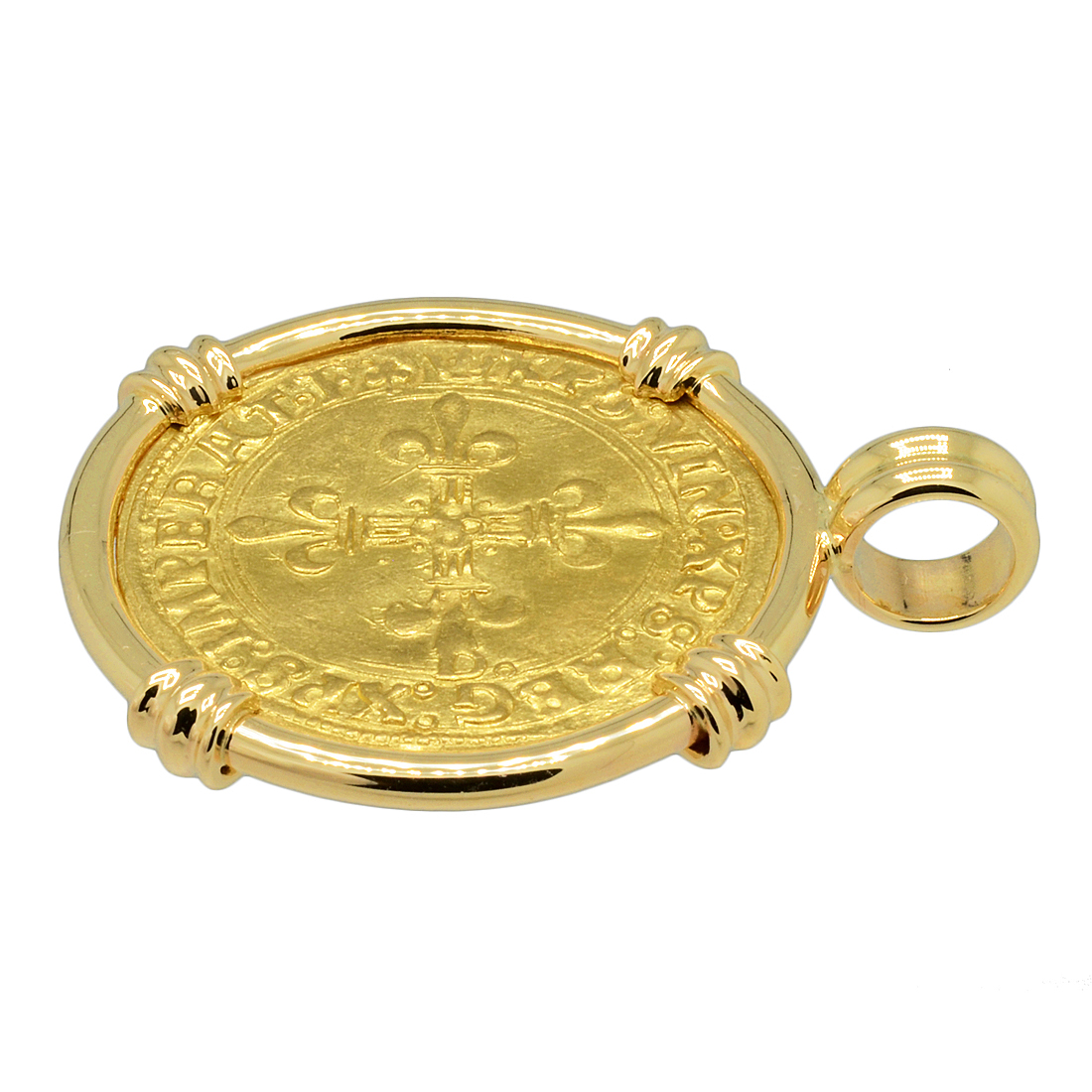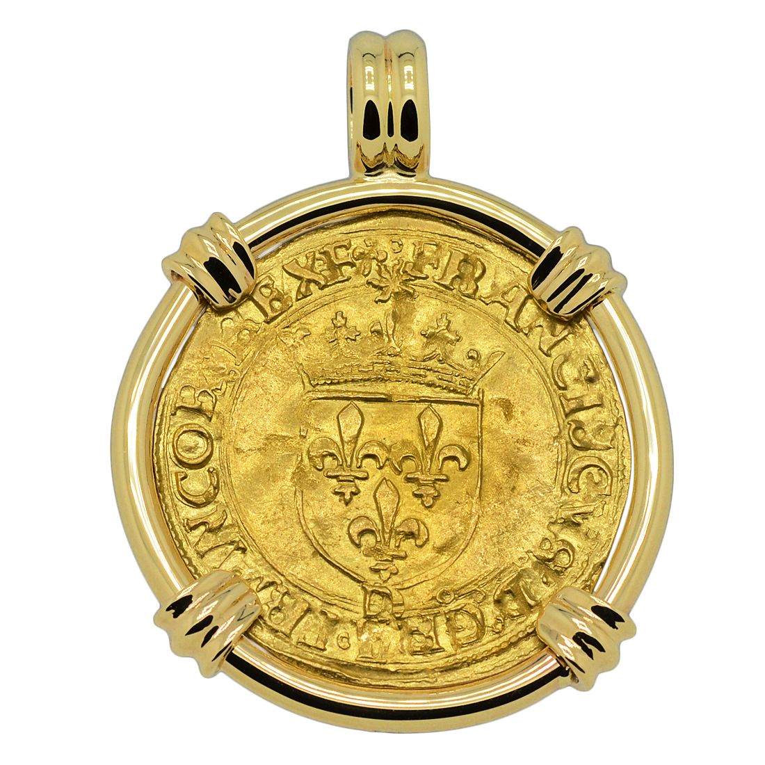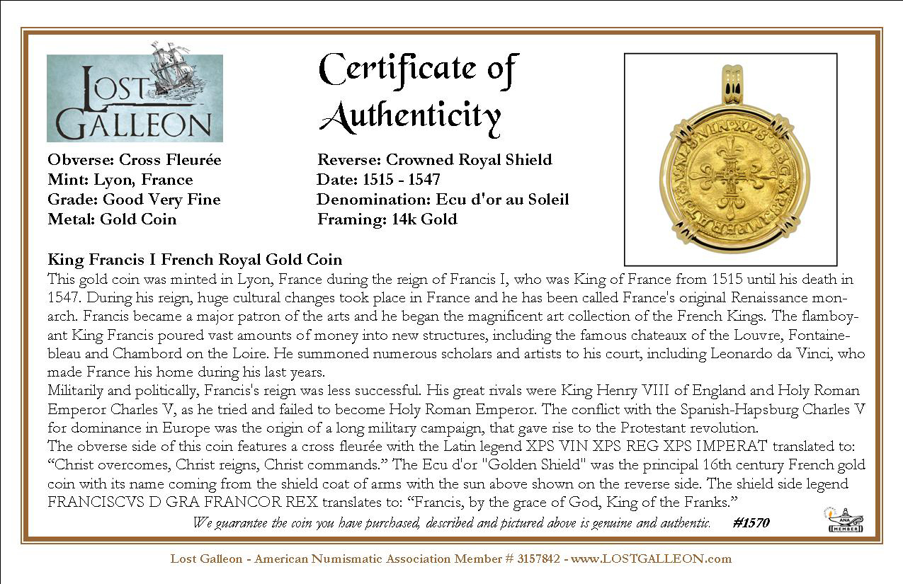This gold coin was minted in Lyon, France during the reign of Francis I, who was King of France from 1515 until his death in 1547. During his reign, huge cultural changes took place in France and he has been called France's original Renaissance monarch. Francis became a major patron of the arts and he began the magnificent art collection of the French Kings. The flamboyant King Francis poured vast amounts of money into new structures, including the famous chateaux of the Louvre, Fontainebleau and Chambord on the Loire. He summoned numerous scholars and artists to his court, including Leonardo da Vinci, who made France his home during his last years.