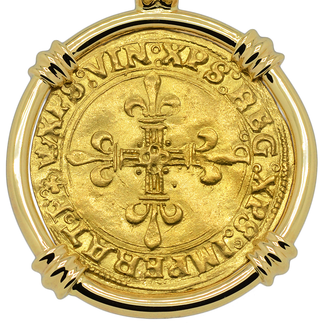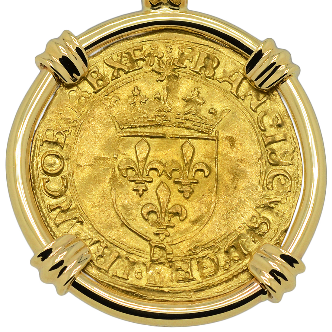 The obverse side of this coin features a cross fleurée with the Latin legend XPS VIN XPS REG XPS IMPERAT translated to: “Christ overcomes, Christ reigns, Christ commands.” The Ecu d'or "Golden Shield" was the principal 16th century French gold coin with its name coming from the shield coat of arms with the sun above shown on the reverse side. The shield side legend FRANCISCVS D GRA FRANCOR REX translates to: “Francis, by the grace of God, King of the Franks.”