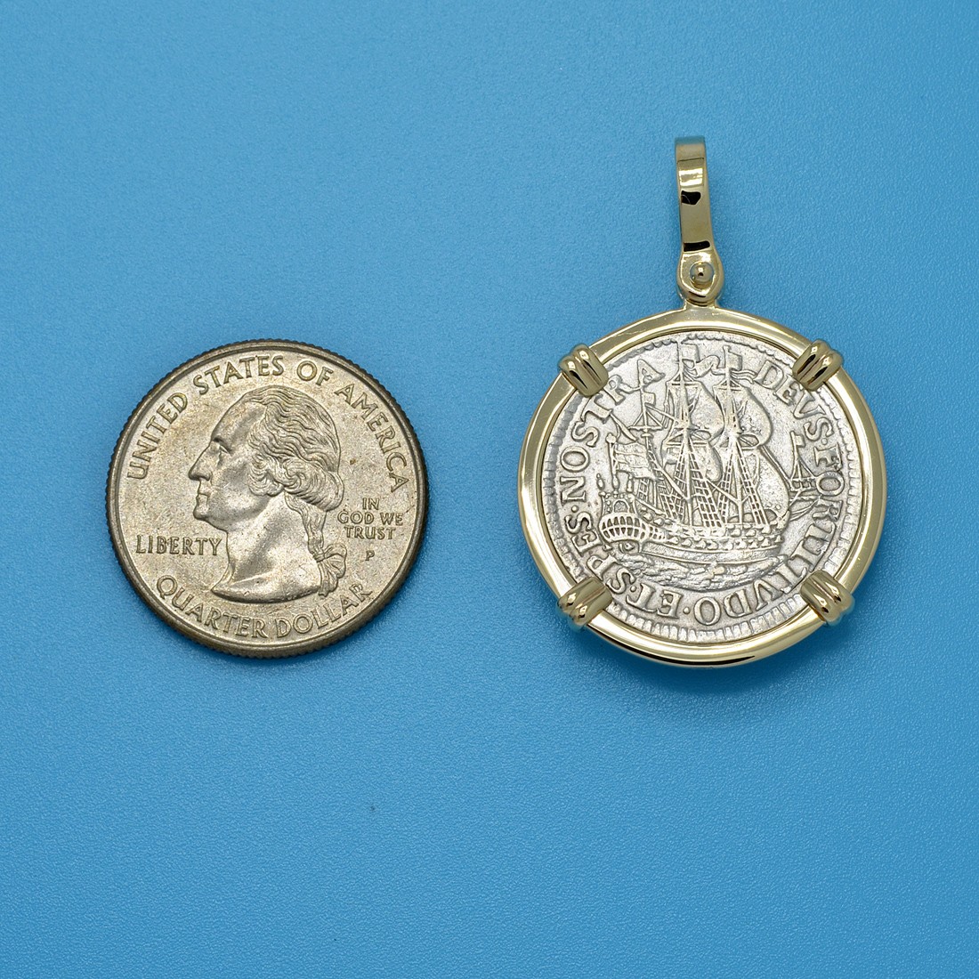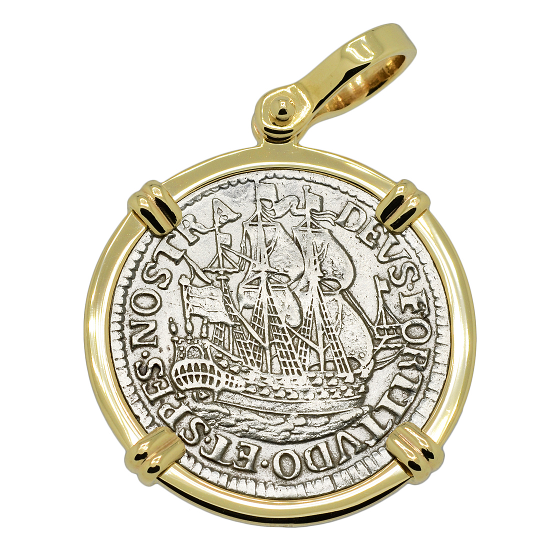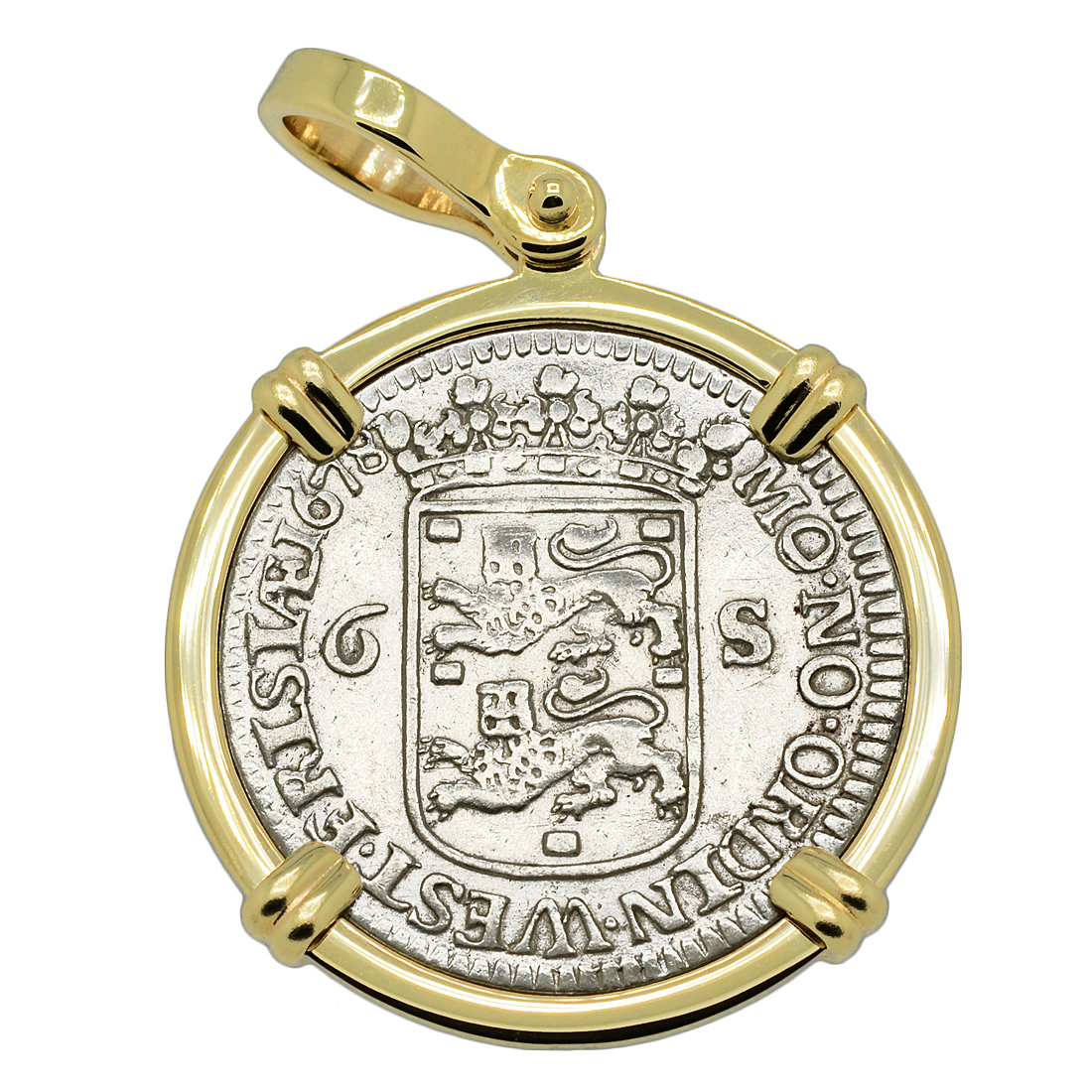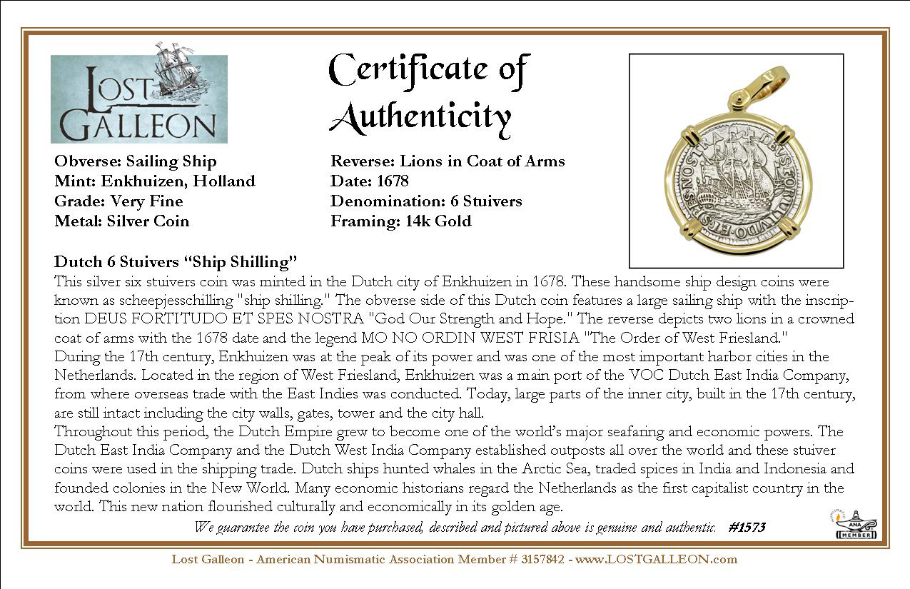 This silver six stuivers coin was minted in the Dutch city of Enkhuizen in 1678. These handsome ship design coins were known as scheepjesschilling "ship shilling." The obverse side of this Dutch coin features a large sailing ship with the inscription DEUS FORTITUDO ET SPES NOSTRA "God Our Strength and Hope." The reverse depicts two lions in a crowned coat of arms with the 1678 date and the legend MO NO ORDIN WEST FRISIA "The Order of West Friesland."