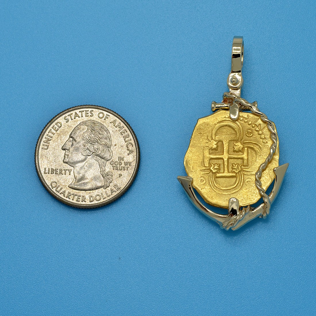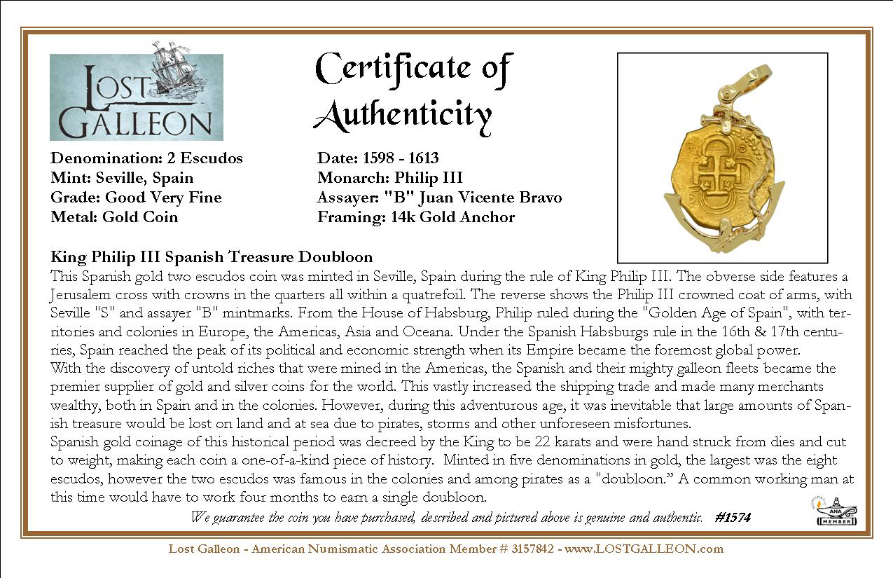 Spanish gold coinage of this historical period was decreed by the King to be 22 karats and were hand struck from dies and cut to weight, making each coin a one-of-a-kind piece of history. Minted in five denominations in gold, the largest was the eight escudos, however the two escudos was famous in the colonies and among pirates as a "doubloon.” A common working man at this time would have to work four months to earn a single doubloon.