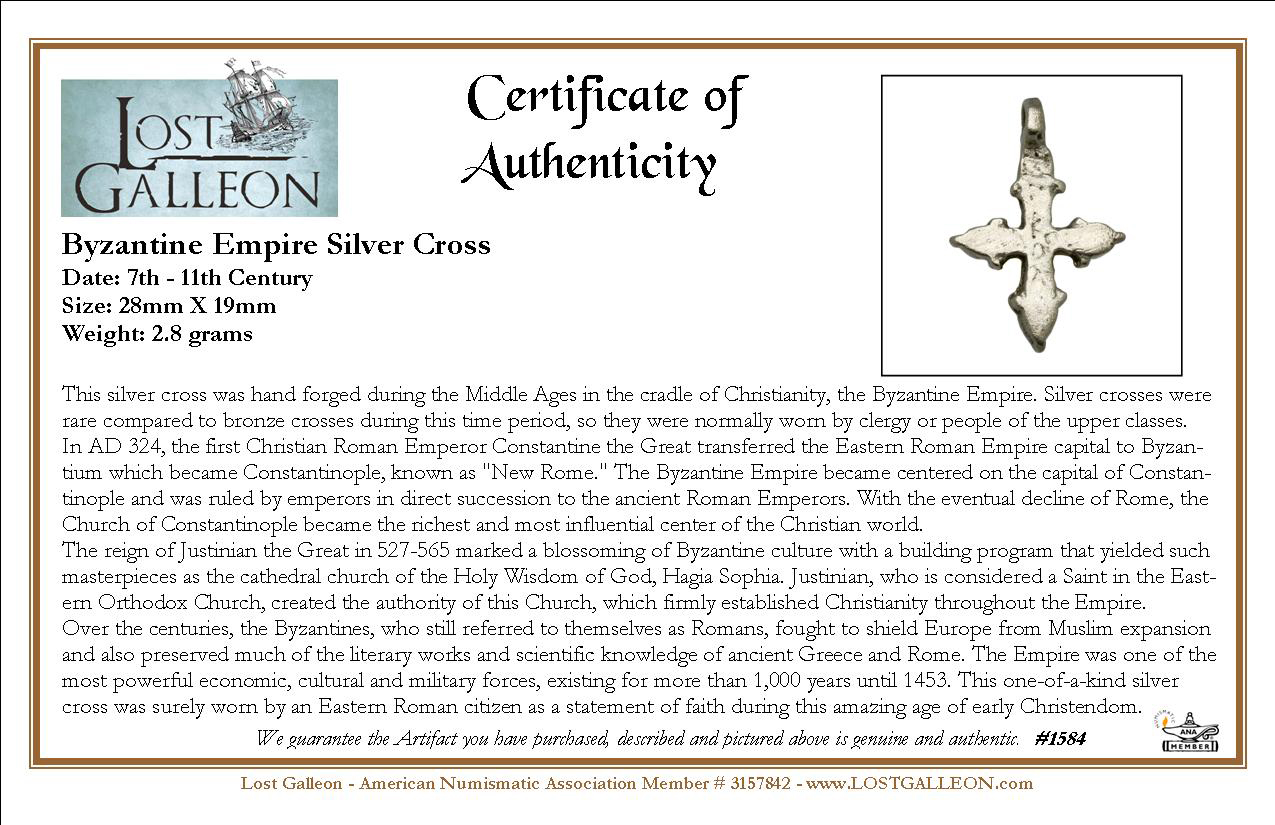 Over the centuries, the Byzantines, who still referred to themselves as Romans, fought to shield Europe from Muslim expansion and also preserved much of the literary works and scientific knowledge of ancient Greece and Rome. The Empire was one of the most powerful economic, cultural and military forces, existing for more than 1,000 years until 1453. This one-of-a-kind silver cross was surely worn by an Eastern Roman citizen as a statement of faith during this amazing age of early Christendom.