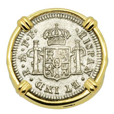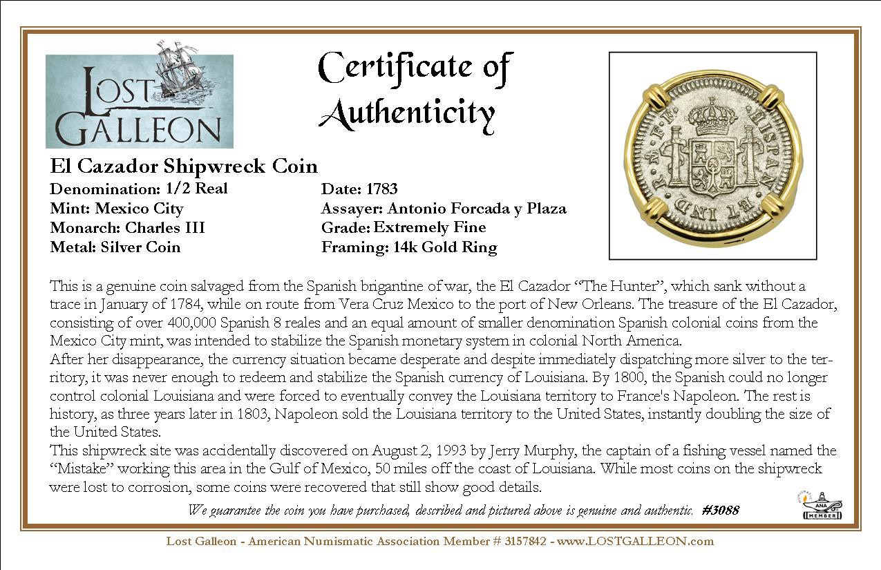 El Cazador shipwreck coin certificate also included. This is a genuine coin salvaged from the Spanish brigantine of war, the El Cazador “The Hunter”, which sank without a trace in January of 1784, while on route from Vera Cruz Mexico to the port of New Orleans. The treasure of the El Cazador, consisting of over 400,000 Spanish 8 reales and an equal amount of smaller denomination Spanish colonial coins from the Mexico City mint, was intended to stabilize the Spanish monetary system in colonial North America.