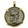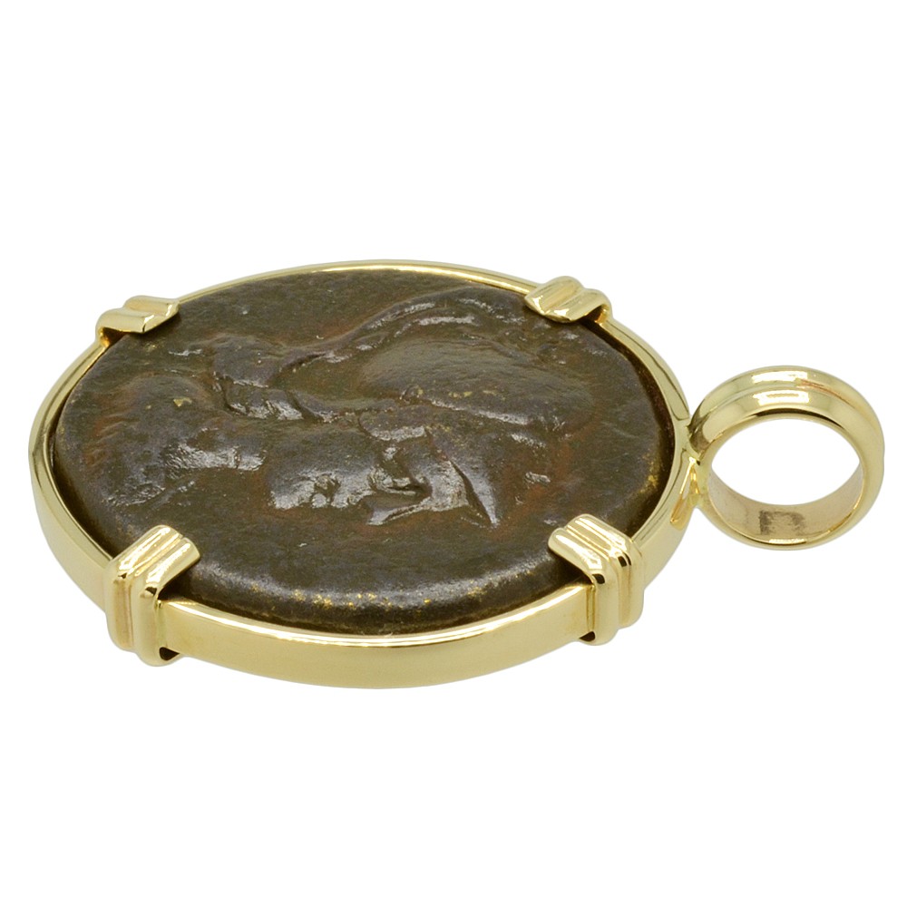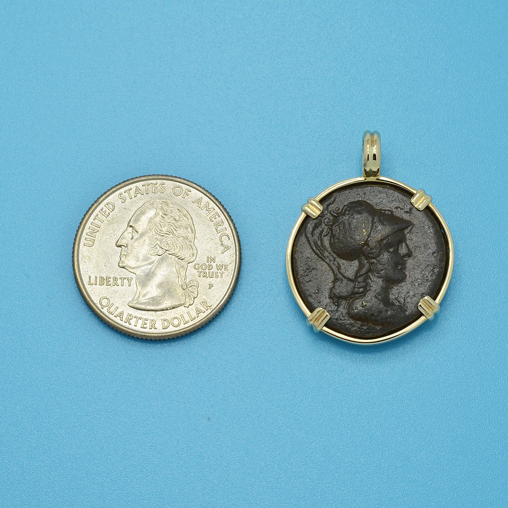 Athena is featured on this ancient coin wearing a high-crested Corinthian helmet and aegis. She was the Greek goddess of wisdom, peace, warfare, strategy, handicrafts and reason. Among her gifts to man were the inventions of the plow and the flute, the arts of taming animals, building ships along with making shoes. An armed warrior goddess, Athena appears in Greek mythology as a helper of many heroes, including Odysseus, Jason and Hercules.