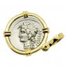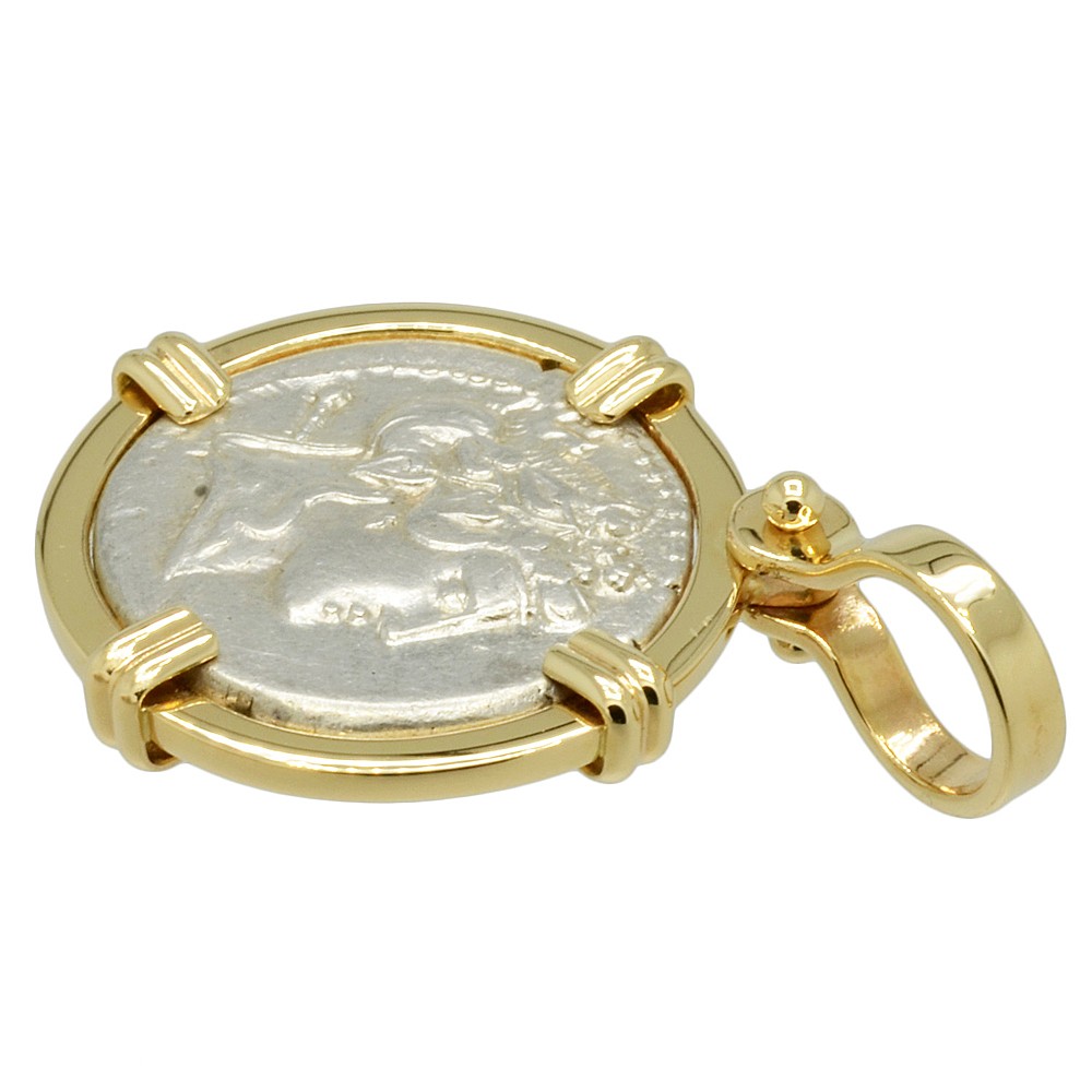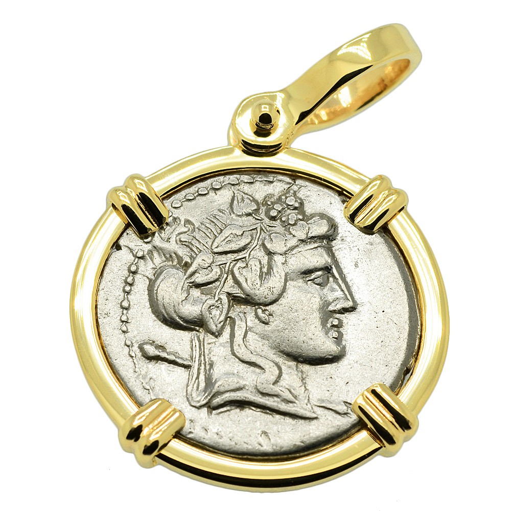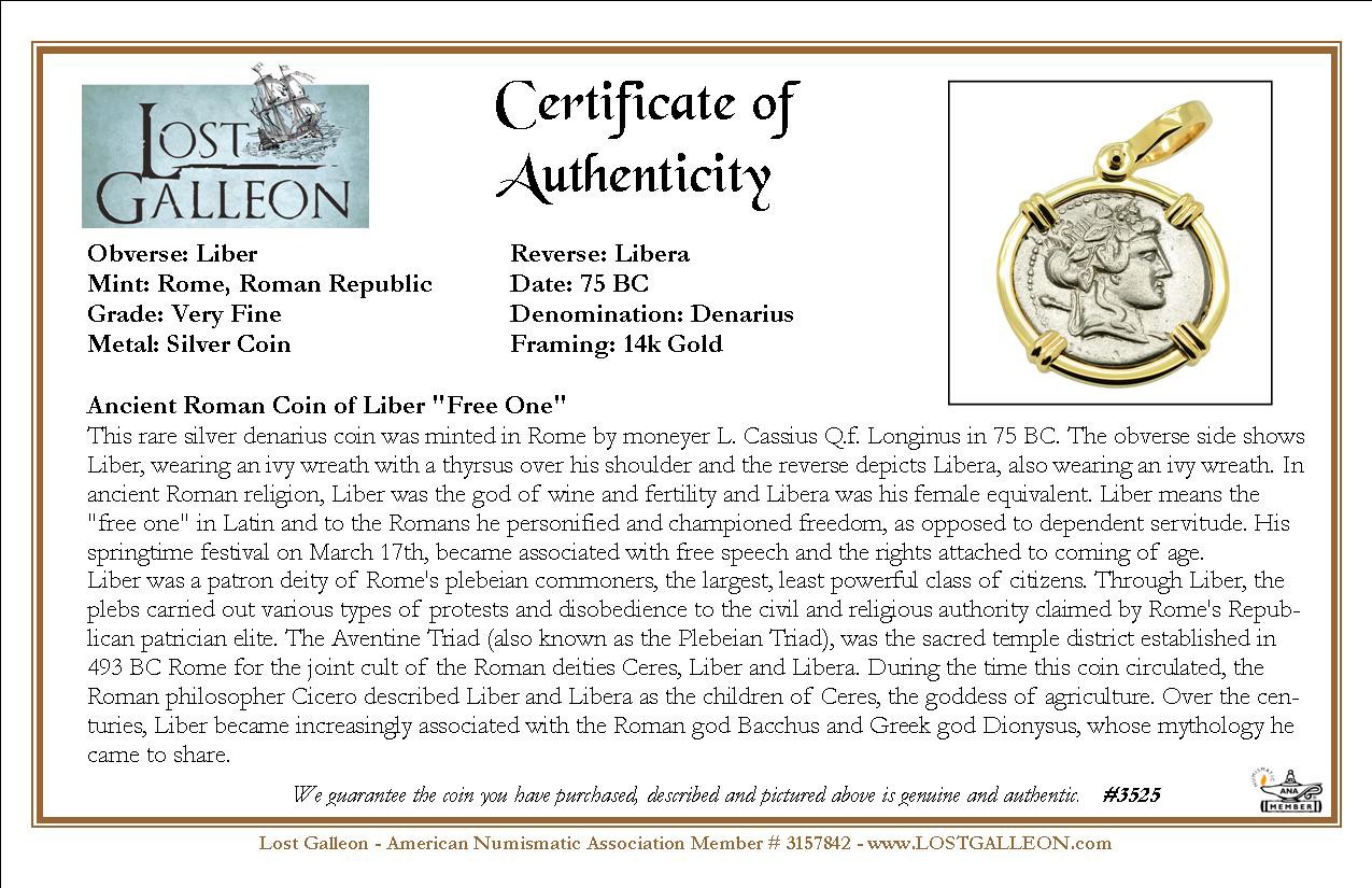 This rare silver denarius coin was minted in Rome by moneyer L. Cassius Q.f. Longinus in 75 BC. The obverse side shows Liber, wearing an ivy wreath with a thyrsus over his shoulder and the reverse depicts Libera, also wearing an ivy wreath. In ancient Roman religion, Liber was the god of wine and fertility and Libera was his female equivalent. Liber means the "free one" in Latin and to the Romans he personified and championed freedom, as opposed to dependent servitude. His springtime festival on March 17th, became associated with free speech and the rights attached to coming of age.