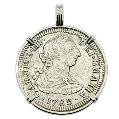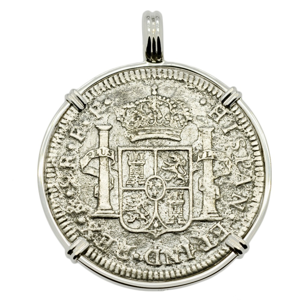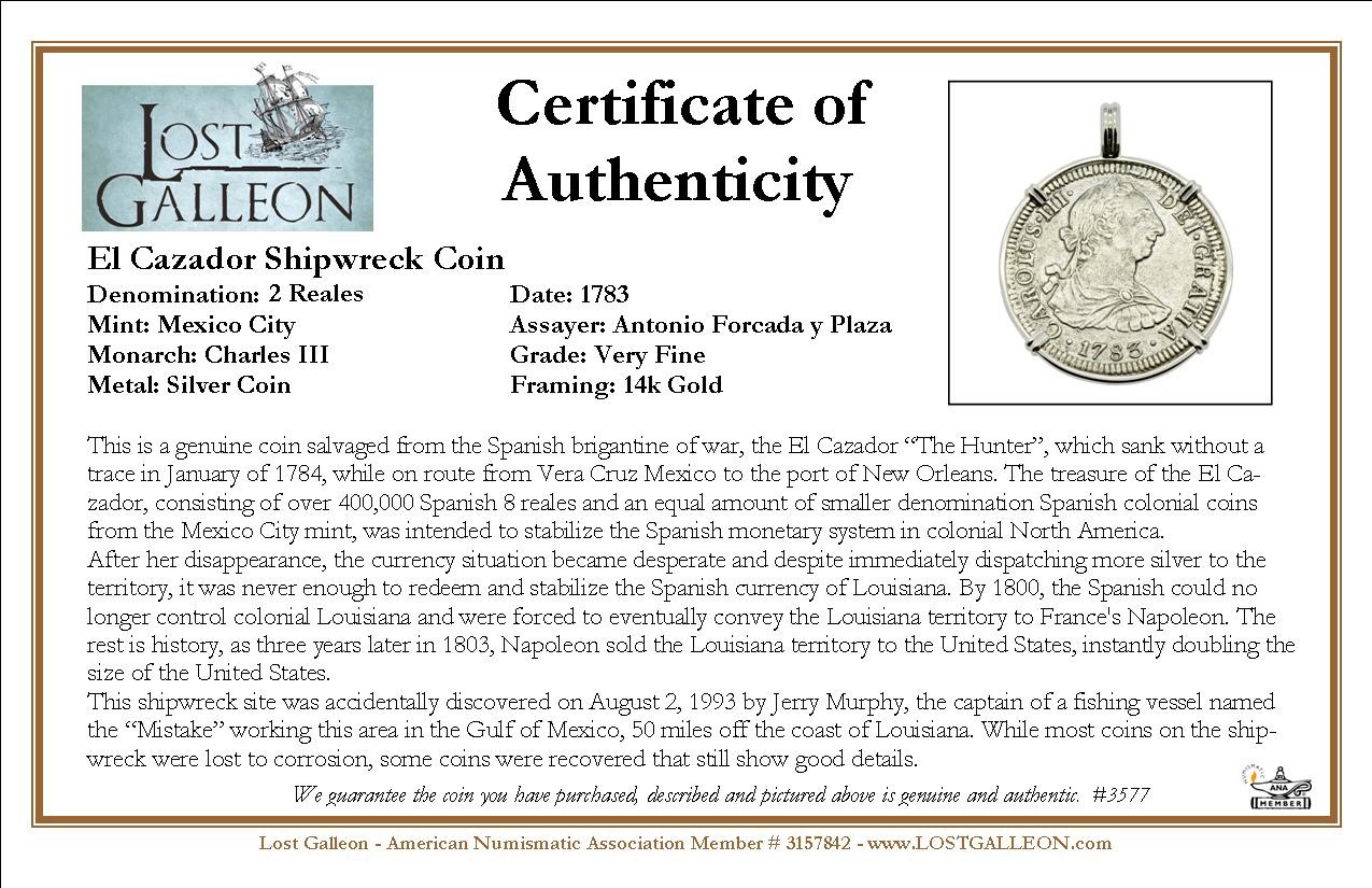 El Cazador shipwreck coin certificate also included. This is a genuine coin salvaged from the Spanish brigantine of war, the El Cazador “The Hunter” which sank without a trace in January of 1784 while on route from Vera Cruz Mexico to the port of New Orleans. The treasure of the El Cazador, consisting of over 400,000 Spanish 8 reales and an equal amount of smaller denomination Spanish colonial coins from the Mexico City mint, was intended to stabilize the Spanish monetary system in colonial North America. After her disappearance, the currency situation became desperate and despite immediately dispatching more silver to the territory, it was never enough to redeem and stabilize the Spanish currency of Louisiana.