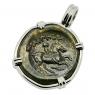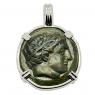 This ancient bronze coin features the head of Apollo wearing a laurel wreath. In ancient Greek mythology, Apollo was a very important Olympian deity and was also seen as the most beautiful god. He was the patron god of archers and was recognized as the god of light and the sun, truth and prophecy, music, poetry and the arts. Apollo was the son of Zeus and as the patron of Delphi, Apollo was the prophetic deity of the Delphic Oracle. Medicine and healing were also associated with Apollo and he was seen as a god who had the ability to cure. The reverse side of this coins shows a youth rider on horseback. Equestrian athletic events were popular throughout the ancient Greek world.