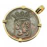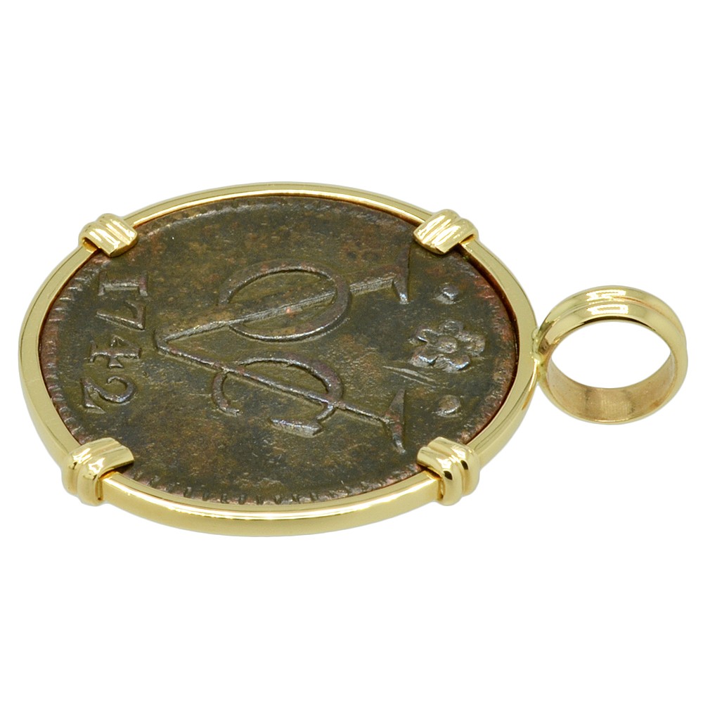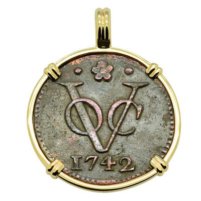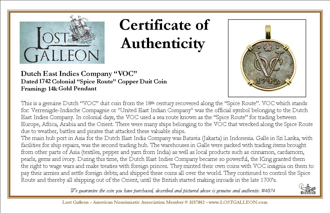 This is a genuine Dutch “VOC” duit coin from the 18th century recovered along the “Spice Route”. VOC which stands for: Verrenigde-Indische Compagnie or "United East Indian Company" was the official symbol belonging to the Dutch East Indies Company. In colonial days, the VOC used a sea route known as the “Spice Route” for trading between Europe, Africa, Arabia and the Orient. There were many ships belonging to the VOC that wrecked along the Spice Route due to weather, battles and pirates that attacked these valuable ships.
