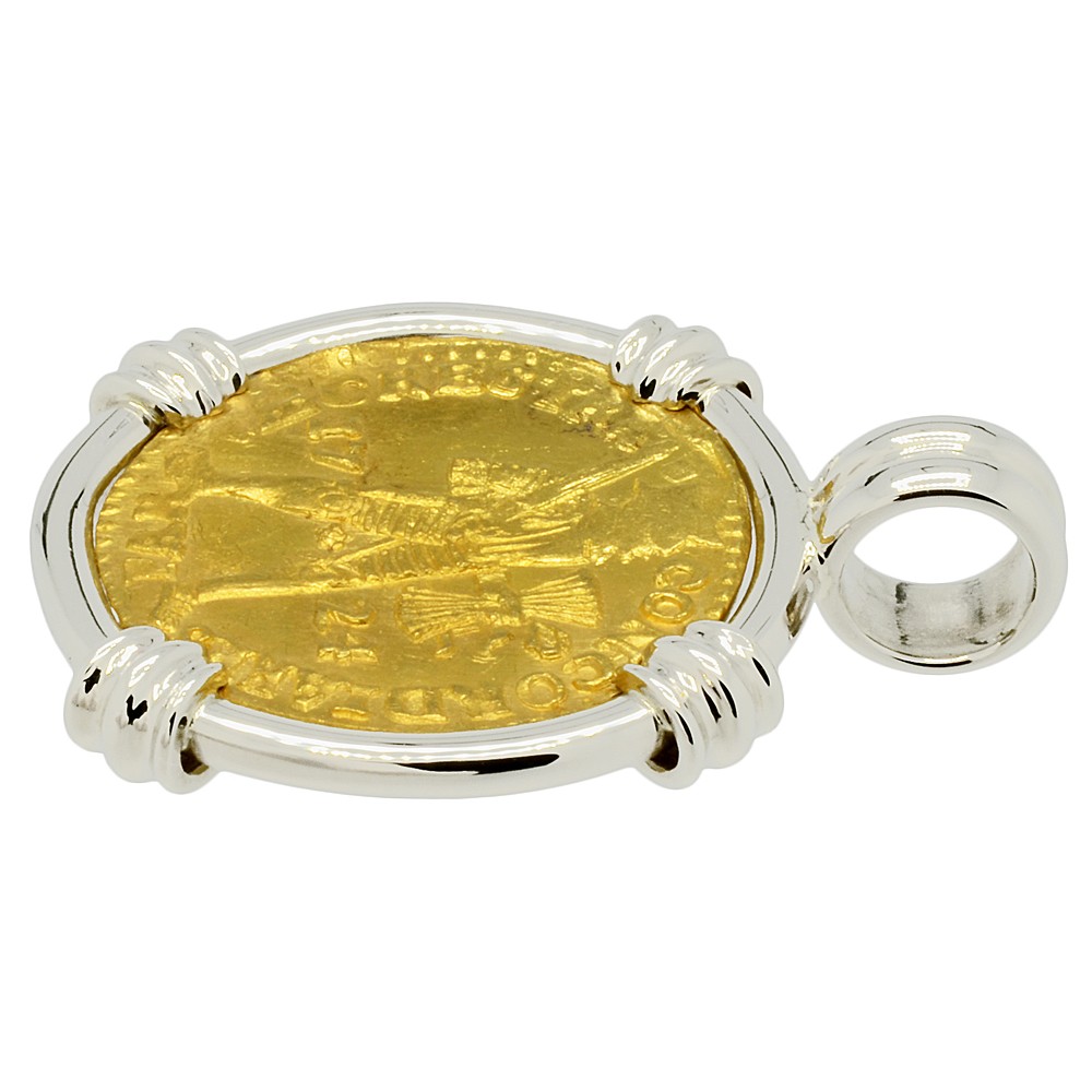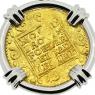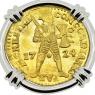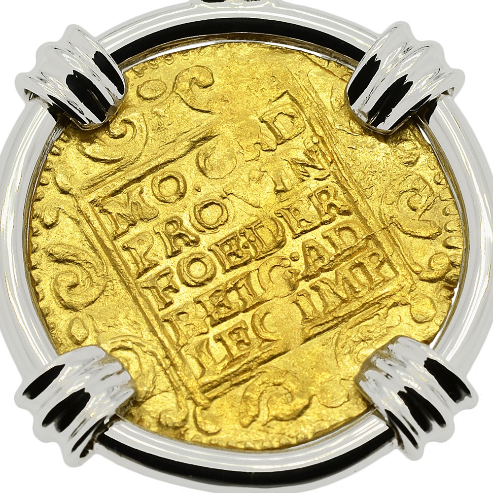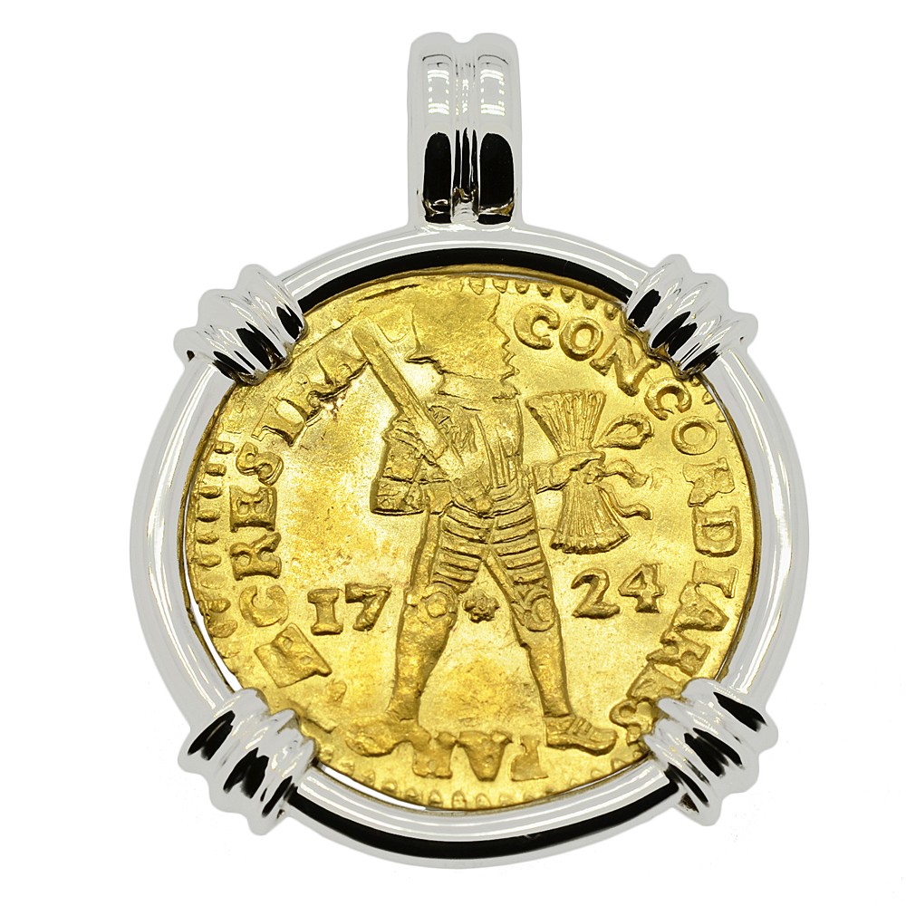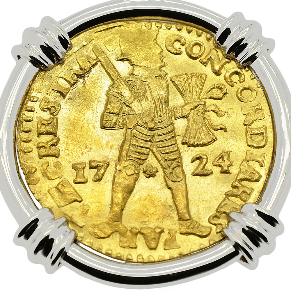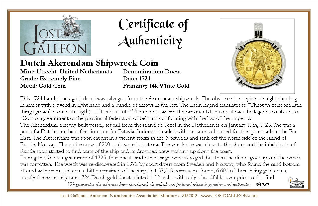 This 1724 hand struck gold ducat was salvaged from the Akerendam shipwreck. The obverse side depicts a knight standing in armor with a sword in right hand and a bundle of arrows in the left. The Latin legend translates to "Through concord little things grow (union is strength) – Utrecht mint.” The reverse, within the ornamental square, shows the legend translated to "Coin of government of the provincial federation of Belgium conforming with the law of the Imperial."