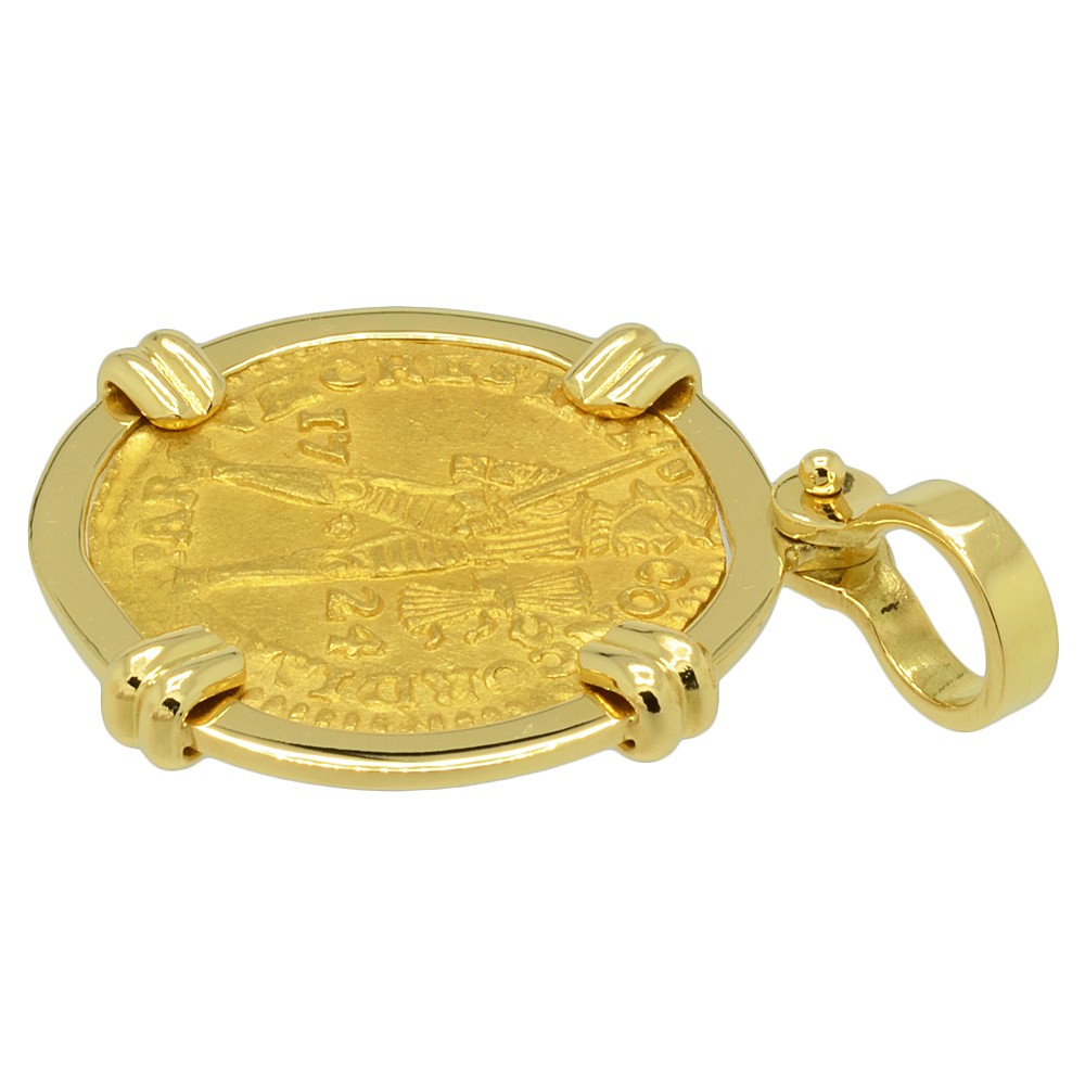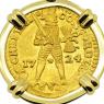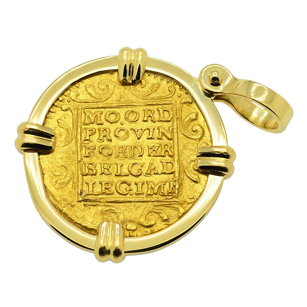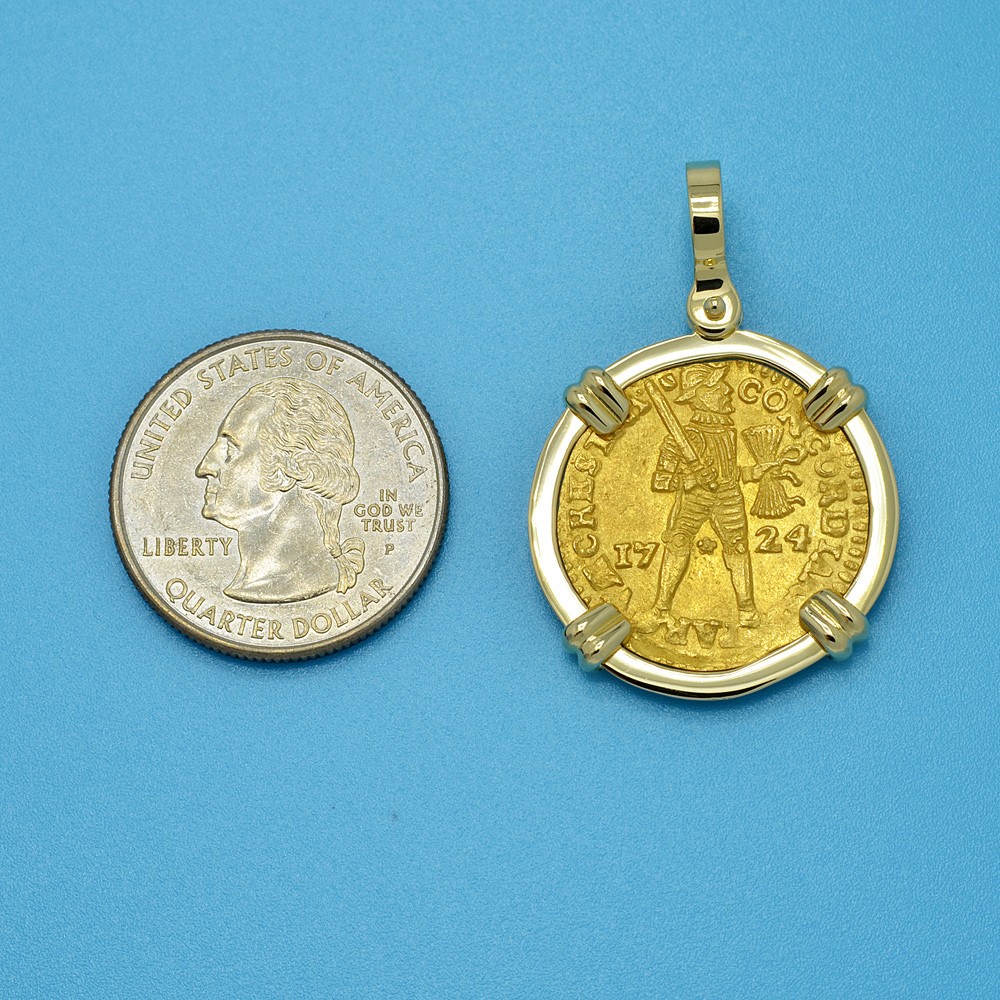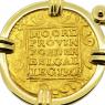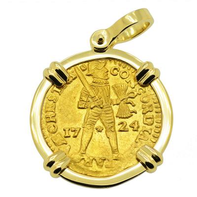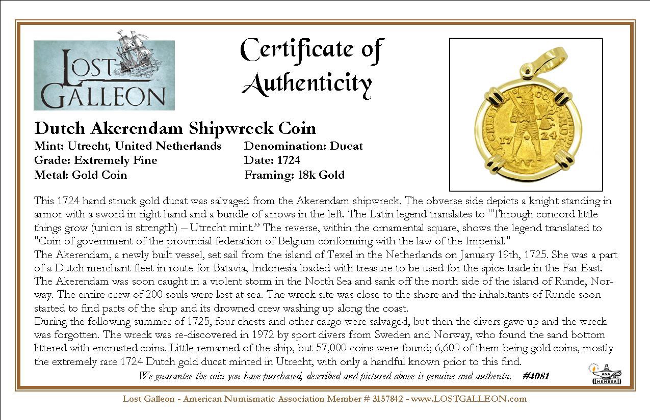 This 1724 hand struck gold ducat was salvaged from the Akerendam shipwreck. The obverse side depicts a knight standing in armor with a sword in right hand and a bundle of arrows in the left. The Latin legend translates to "Through concord little things grow (union is strength) – Utrecht mint.” The reverse, within the ornamental square, shows the legend translated to "Coin of government of the provincial federation of Belgium conforming with the law of the Imperial."