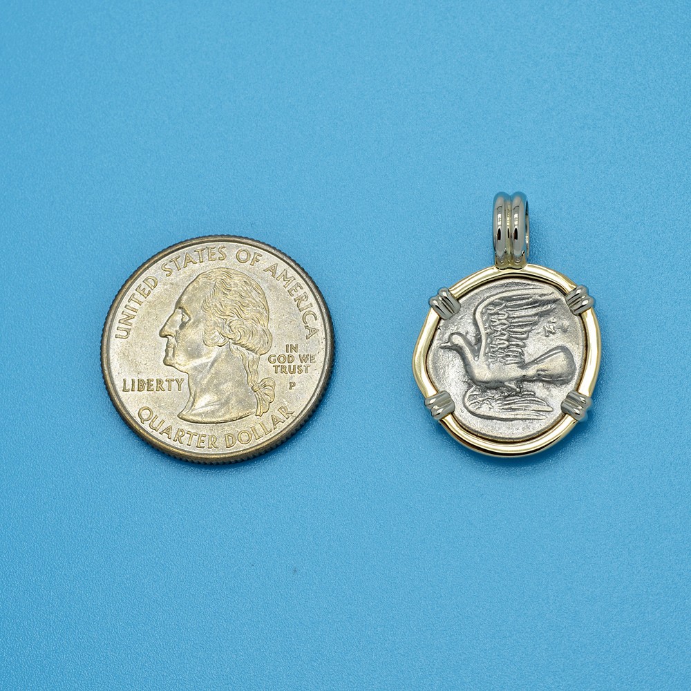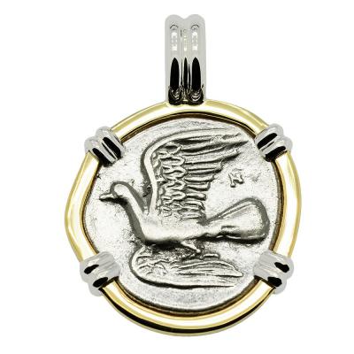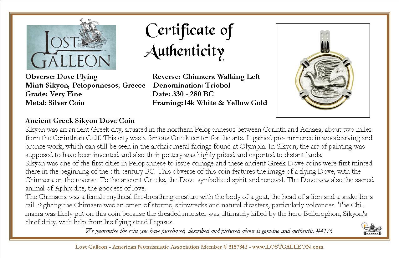 Sikyon was one of the first cities in Peloponnese to issue coinage and these ancient Greek Dove coins were first minted there in the beginning of the 5th century BC. This obverse of this coin features the image of a flying Dove, with the Chimaera on the reverse. To the ancient Greeks, the Dove symbolized spirit and renewal. The Dove was also the sacred animal of Aphrodite, the goddess of love.