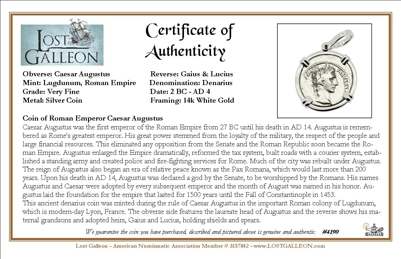 This ancient denarius coin was minted during the rule of Caesar Augustus in the important Roman colony of Lugdunum, which is modern-day Lyon, France. The obverse side features the laureate head of Augustus and the reverse shows his maternal grandsons and adopted heirs, Gaius and Lucius, holding shields and spears.