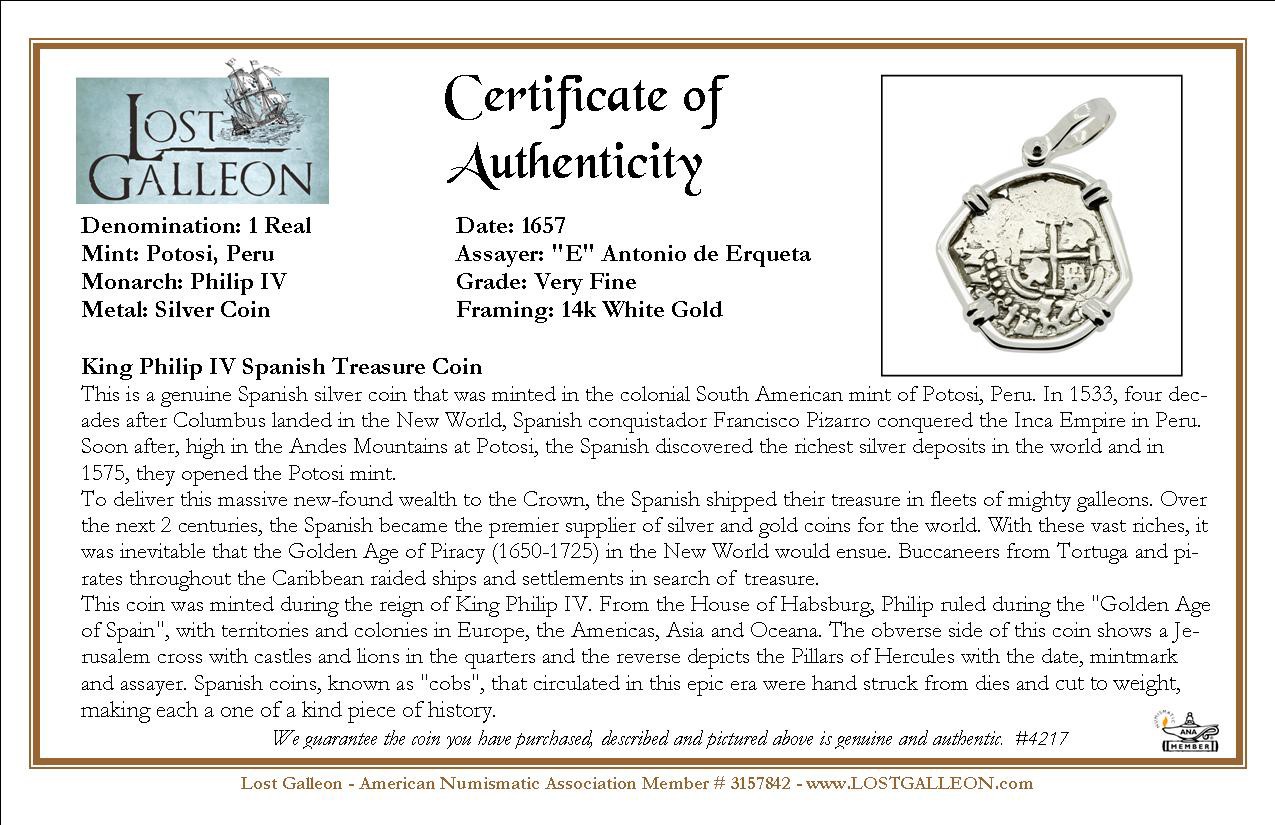 This coin was minted during the reign of King Philip IV. From the House of Habsburg, Philip ruled during the "Golden Age of Spain", with territories and colonies in Europe, the Americas, Asia and Oceana. The obverse side of this coin shows a Jerusalem cross with castles and lions in the quarters and the reverse depicts the Pillars of Hercules with the date, mintmark and assayer. Spanish coins, known as "cobs", that circulated in this epic era were hand struck from dies and cut to weight, making each a one of a kind piece of history.
