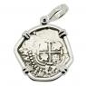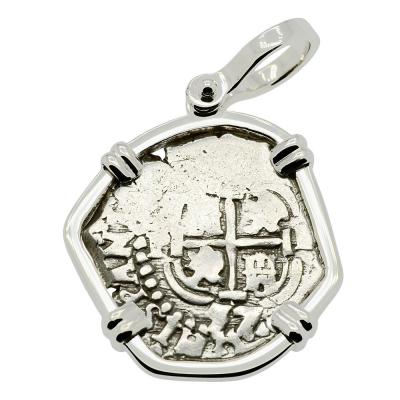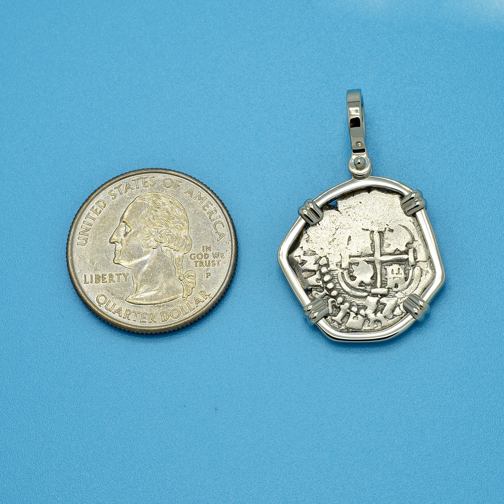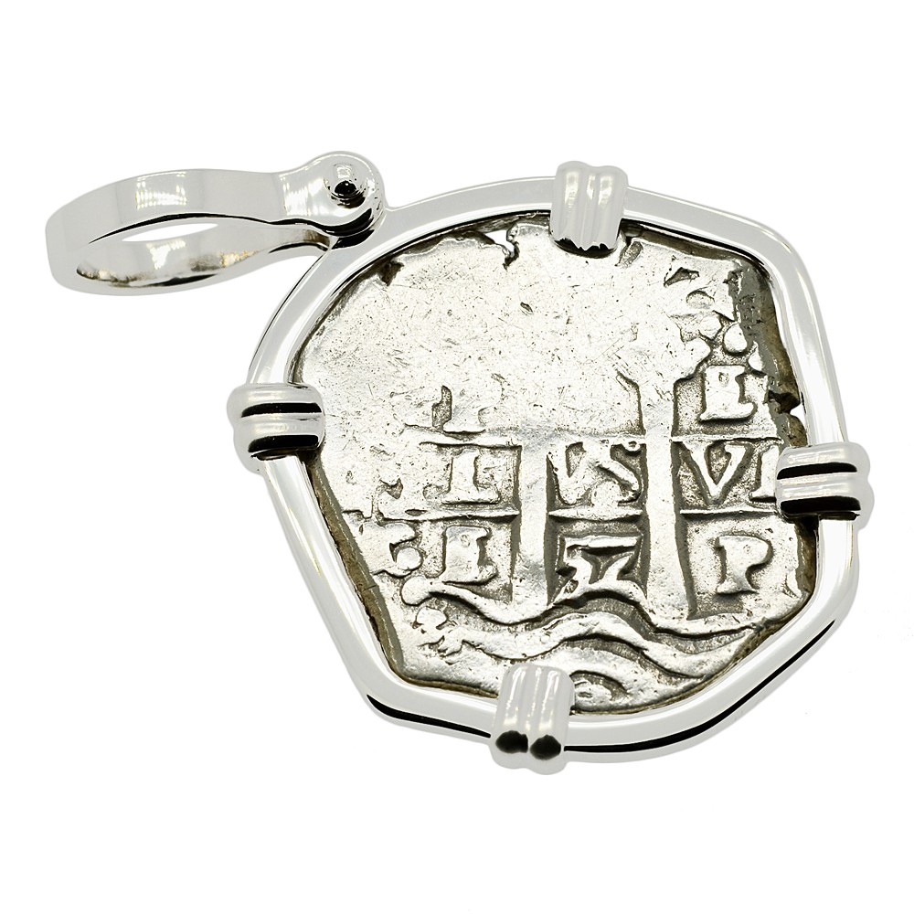 This is a genuine Spanish silver coin that was minted in the colonial South American mint of Potosi, Peru. In 1533, four decades after Columbus landed in the New World, Spanish conquistador Francisco Pizarro conquered the Inca Empire in Peru. Soon after, high in the Andes Mountains at Potosi, the Spanish discovered the richest silver deposits in the world and in 1575, they opened the Potosi mint.