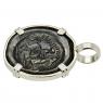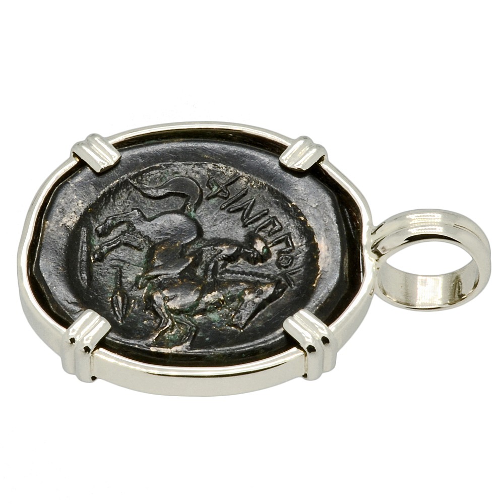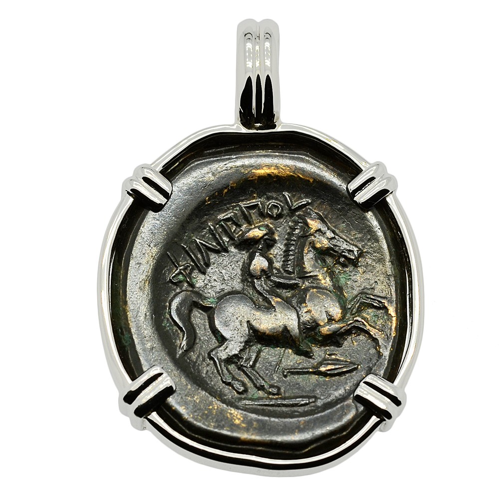 This ancient bronze coin features a youth on horseback. The reverse shows the head of Apollo wearing a laurel wreath. In ancient Greek mythology, Apollo was a very important Olympian deity and was also seen as the most beautiful god. He was the patron god of archers and was recognized as the god of light and the sun; truth and prophecy; music, poetry and the arts. Apollo was the son of Zeus and as the patron of Delphi, Apollo was the prophetic deity of the Delphic Oracle. Medicine and healing were associated with Apollo and he was seen as a god who had the ability to cure.