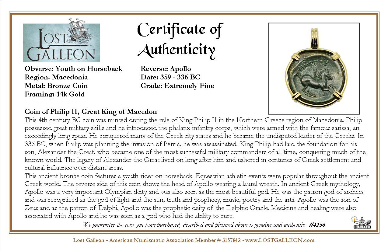 This 4th century BC coin was minted during the rule of King Philip II in the Northern Greece region of Macedonia. Philip possessed great military skills and he introduced the phalanx infantry corps, which were armed with the famous sarissa, an exceedingly long spear. He conquered many of the Greek city states and he became the undisputed leader of the Greeks. In 336 BC, when Philip was planning the invasion of Persia, he was assassinated. King Philip had laid the foundation for his son, Alexander the Great, who became one of the most successful military commanders of all time, conquering much of the known world. The legacy of Alexander the Great lived on long after him and ushered in centuries of Greek settlement and cultural influence over distant areas.
