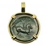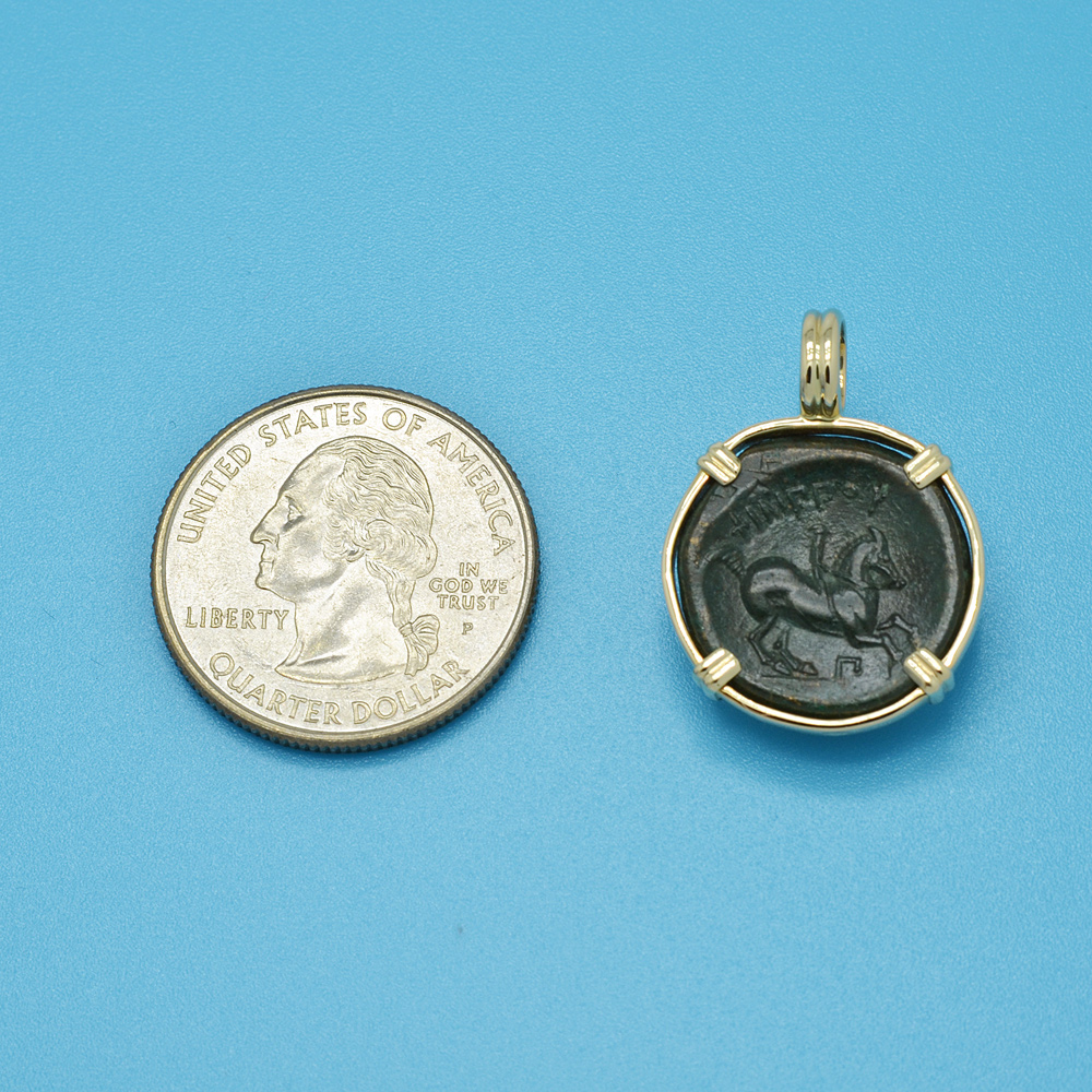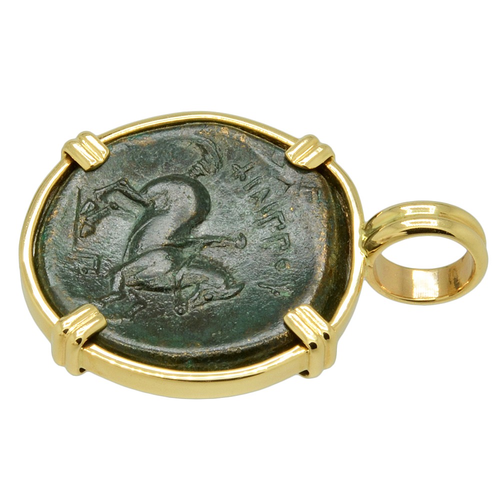 This ancient bronze coin features a youth rider on horseback. Equestrian athletic events were popular throughout the ancient Greek world. The reverse side of this coin shows the head of Apollo wearing a laurel wreath. In ancient Greek mythology, Apollo was a very important Olympian deity and was also seen as the most beautiful god. He was the patron god of archers and was recognized as the god of light and the sun, truth and prophecy, music, poetry and the arts. Apollo was the son of Zeus and as the patron of Delphi, Apollo was the prophetic deity of the Delphic Oracle. Medicine and healing were also associated with Apollo and he was seen as a god who had the ability to cure.