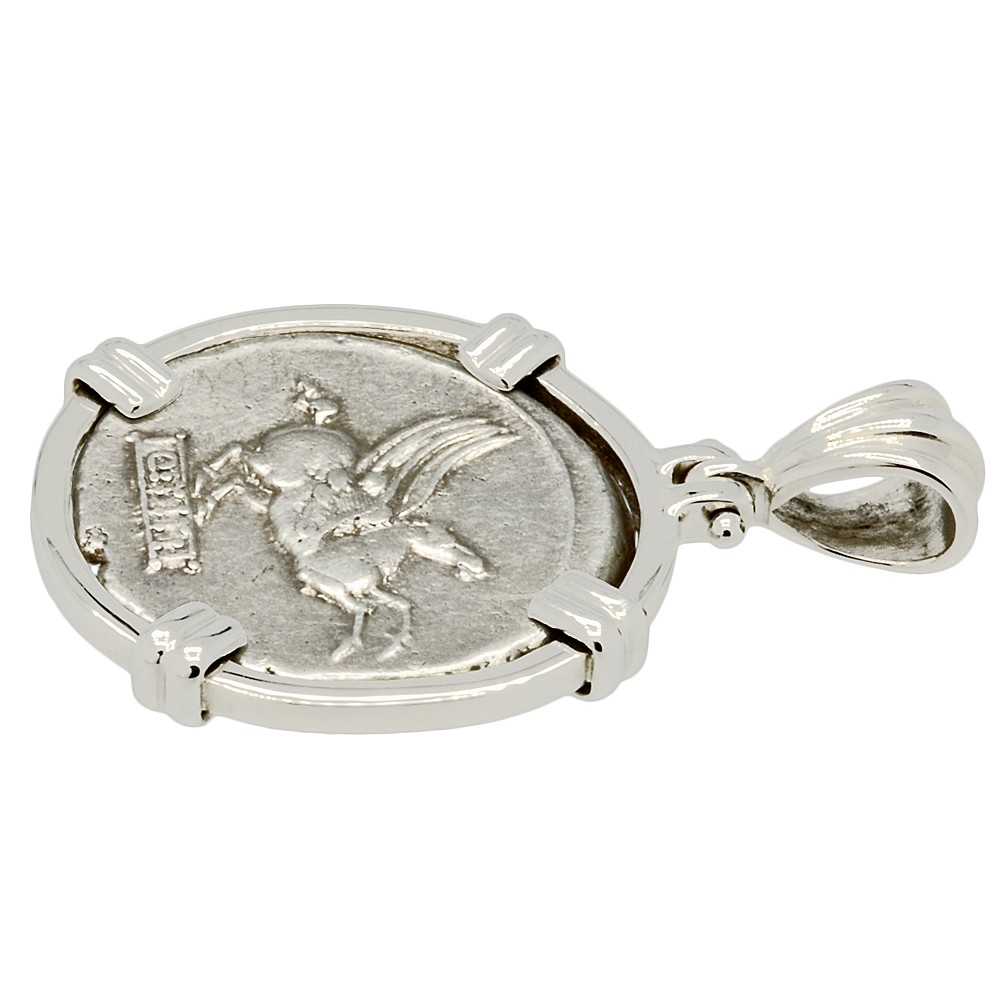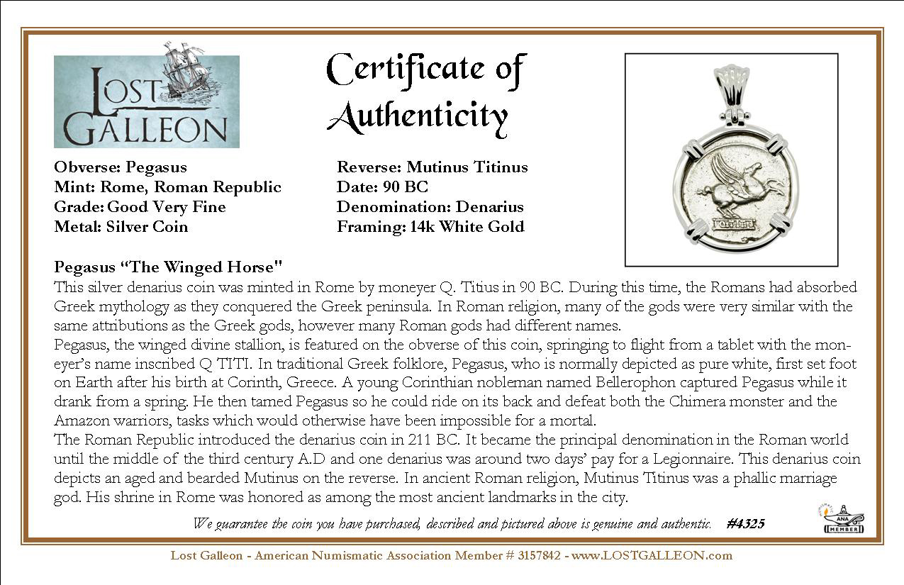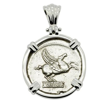 Pegasus, the winged divine stallion, is featured on the obverse of this coin, springing to flight from a tablet with the moneyer's name inscribed Q TITI. In traditional Greek folklore, Pegasus, who is normally depicted as pure white, first set foot on Earth after his birth at Corinth, Greece. A young Corinthian nobleman named Bellerophon captured Pegasus while it drank from a spring. He then tamed Pegasus so he could ride on its back and defeat both the Chimera monster and the Amazon warriors, tasks which would otherwise have been impossible for a mortal.