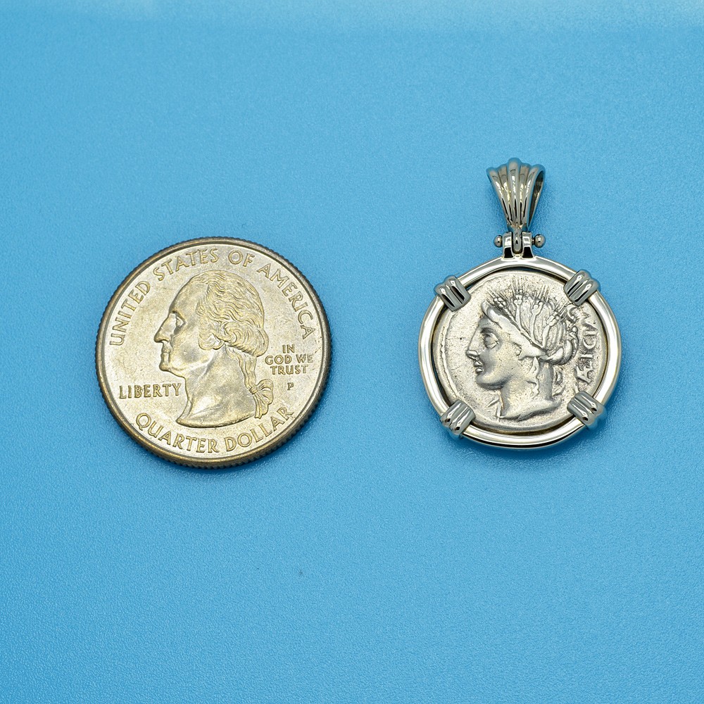 This silver denarius coin was minted in Rome by moneyer L. Cassius Caecianus in 102 BC. Ceres, depicted here with a grain ear wreath, was the ancient Roman goddess of agriculture, grain crops, fertility and motherly relationships. Sister of Jupiter, Ceres is one of the Di Consentes, Rome's equivalent to the Twelve Olympians of Greek mythology. The Romans saw her as the counterpart of the Greek goddess Demeter.