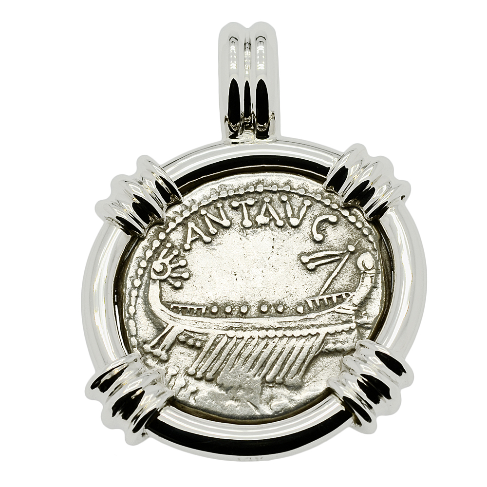 This legionary coin was struck at a military mint traveling with Mark Antony for his fleet and legions and may have been minted with silver from Cleopatra’s treasury. The obverse depicts a Roman galley with oarsmen and the reverse shows an aquila between 2 signa. The aquila, was a prominent eagle standard that each ancient Roman legion carried.