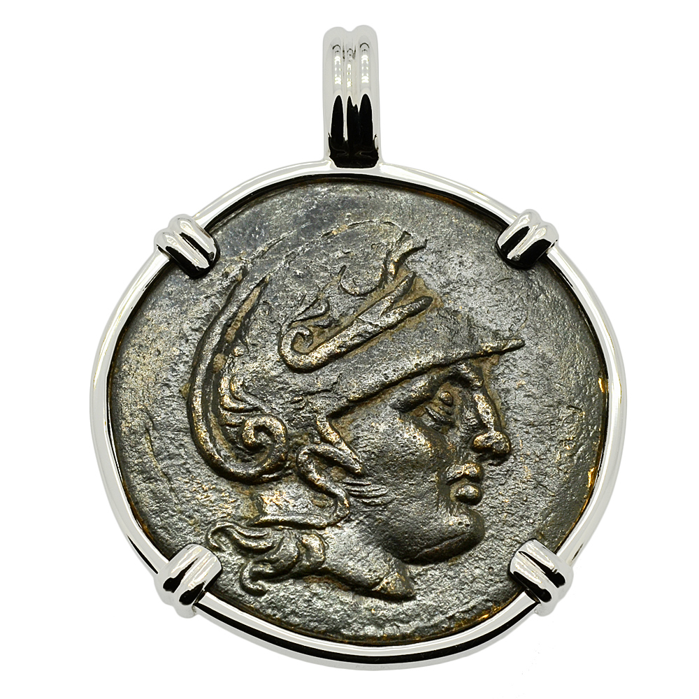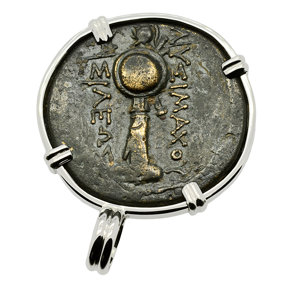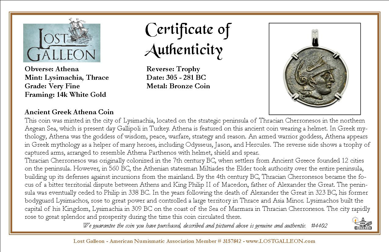 This coin was minted in the city of Lysimachia, located on the strategic peninsula of Thracian Cherronesos in the northern Aegean Sea, which is present day Gallipoli in Turkey. Athena is featured on this ancient coin wearing a helmet. In Greek mythology, Athena was the goddess of wisdom, peace, warfare, strategy and reason. An armed warrior goddess, Athena appears in Greek mythology as a helper of many heroes, including Odysseus, Jason, and Hercules. The reverse side shows a trophy of captured arms, arranged to resemble Athena Parthenos with helmet, shield and spear.