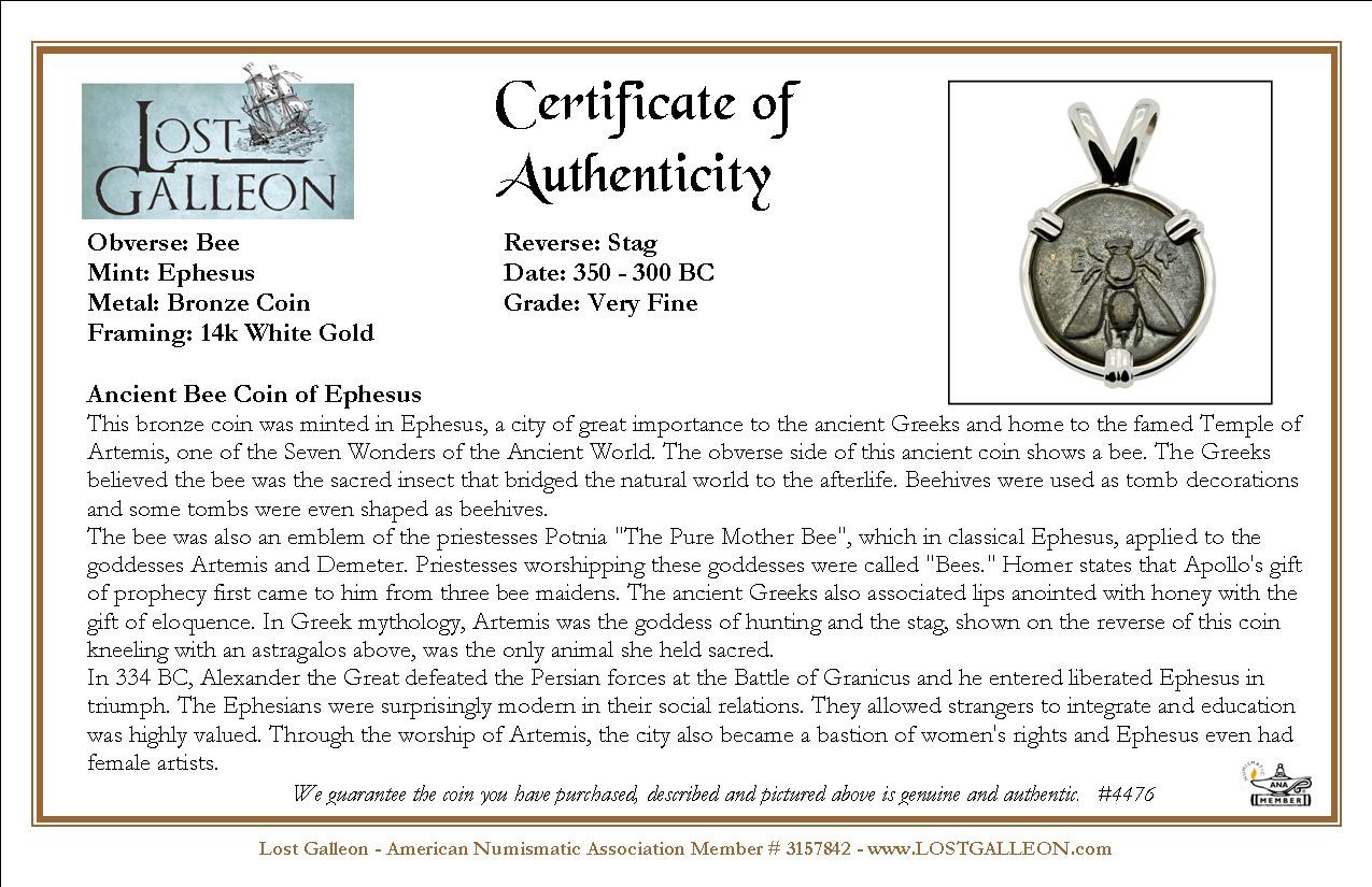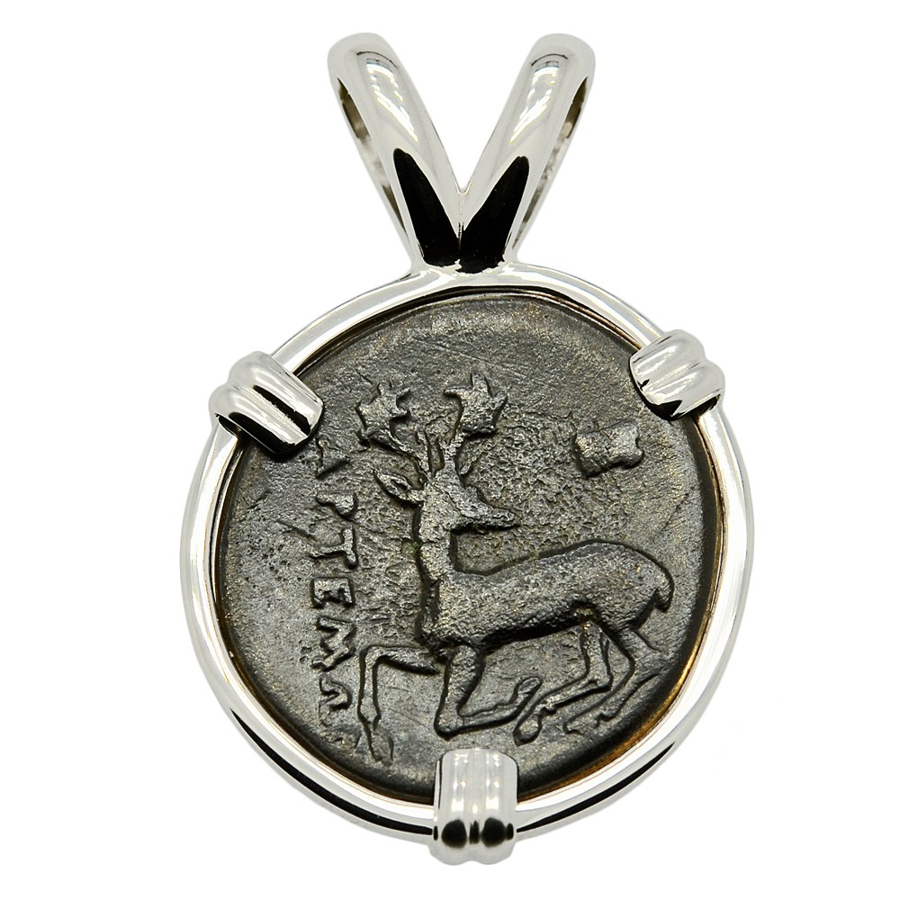 The bee was also an emblem of the priestesses Potnia "The Pure Mother Bee", which in classical Ephesus, applied to the goddesses Artemis and Demeter. Priestesses worshipping these goddesses were called "Bees." Homer states that Apollo's gift of prophecy first came to him from three bee maidens. The ancient Greeks also associated lips anointed with honey with the gift of eloquence. In Greek mythology, Artemis was the goddess of hunting and the stag, shown on the reverse of this coin kneeling with an astragalos above, was the only animal she held sacred.