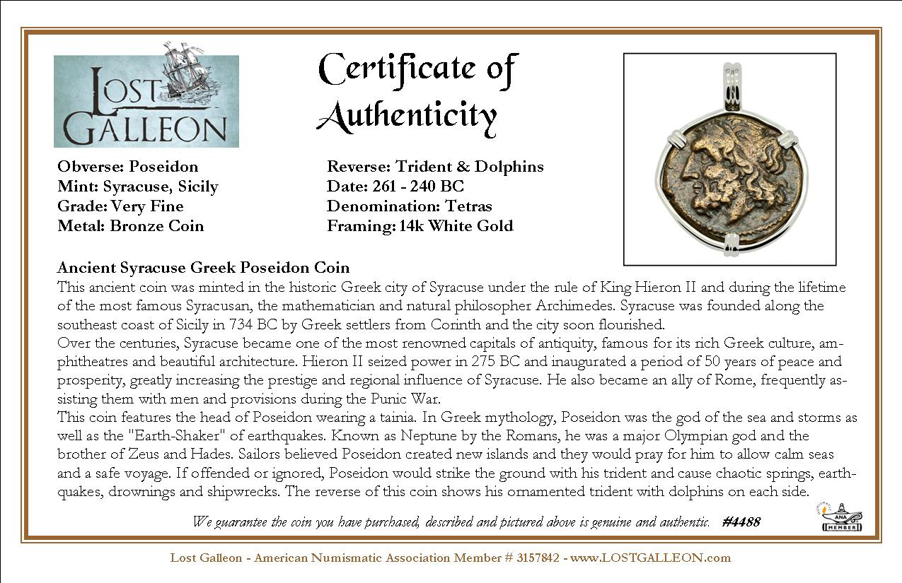This ancient coin was minted in the historic Greek city of Syracuse under the rule of King Hieron II and during the lifetime of the most famous Syracusan, the mathematician and natural philosopher Archimedes. Syracuse was founded along the southeast coast of Sicily in 734 BC by Greek settlers from Corinth and the city soon flourished.