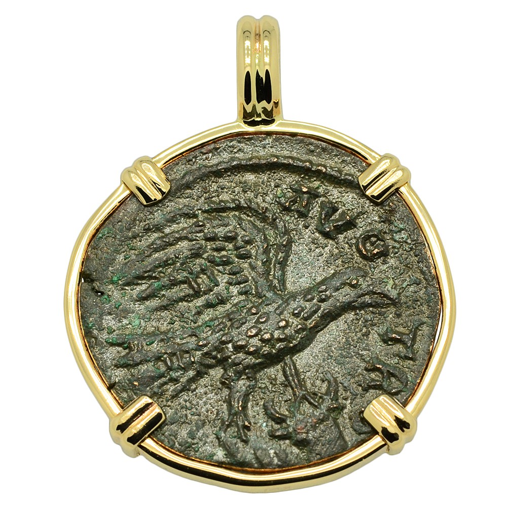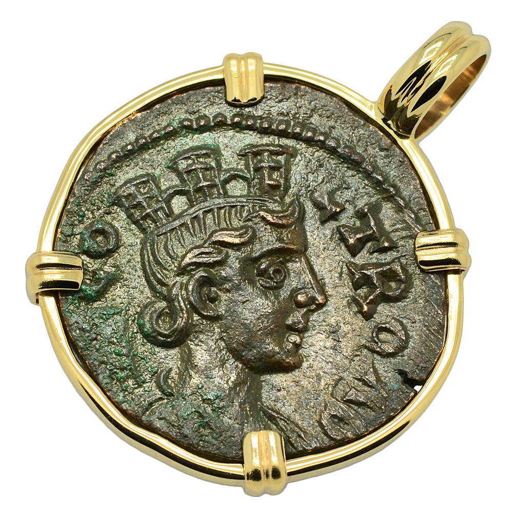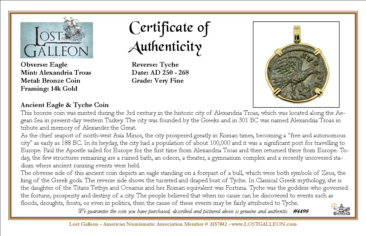The obverse side of this ancient coin depicts an eagle standing on a forepart of a bull, which were both symbols of Zeus, the king of the Greek gods. The reverse side shows the turreted and draped bust of Tyche. In Classical Greek mythology, she is the daughter of the Titans Tethys and Oceanus and her Roman equivalent was Fortuna. Tyche was the goddess who governed the fortune, prosperity and destiny of a city. The people believed that when no cause can be discovered to events such as floods, droughts, frosts, or even in politics, then the cause of these events may be fairly attributed to Tyche.