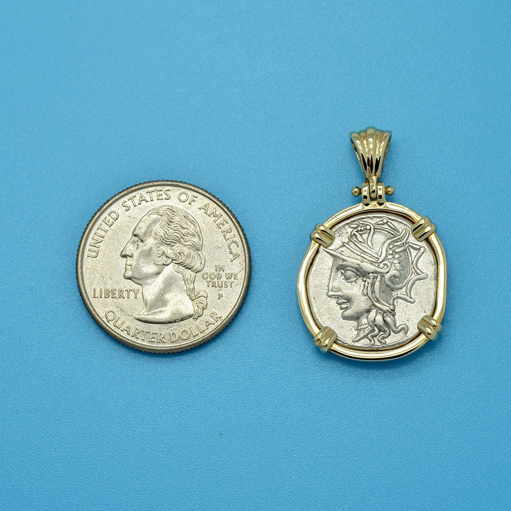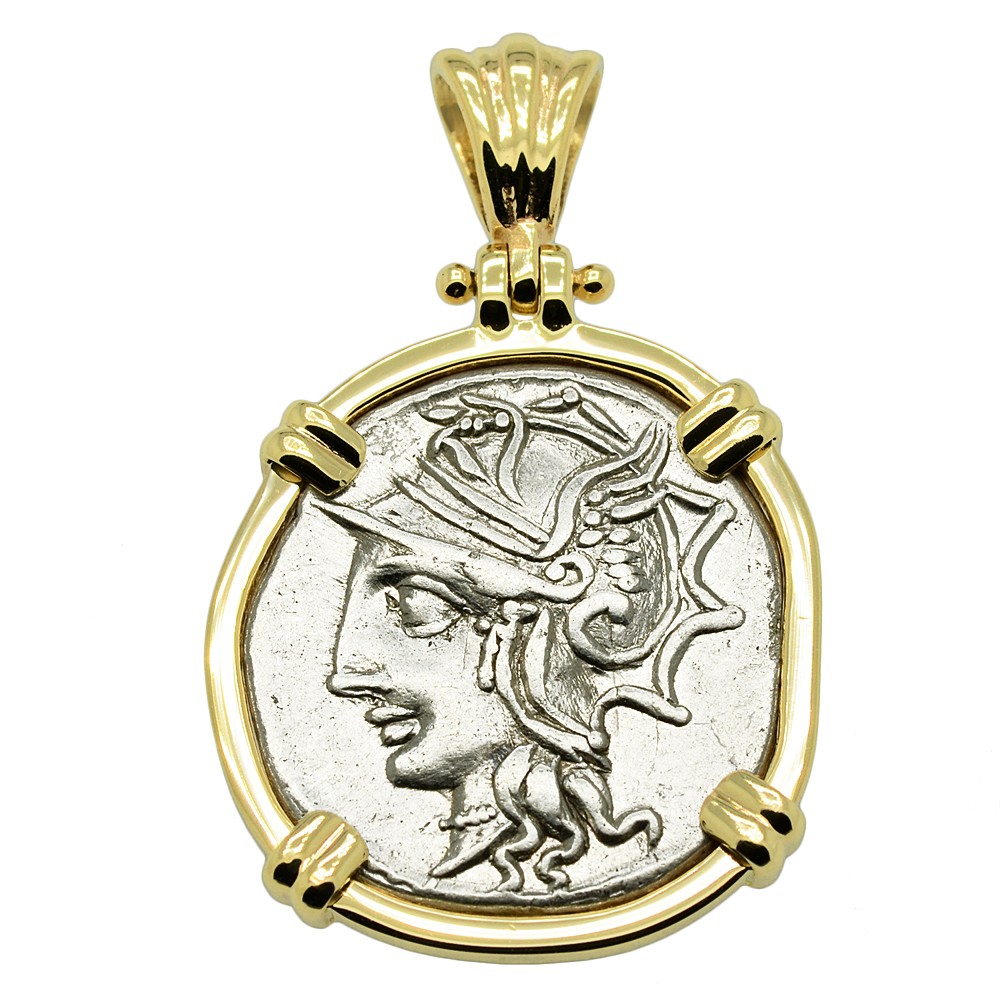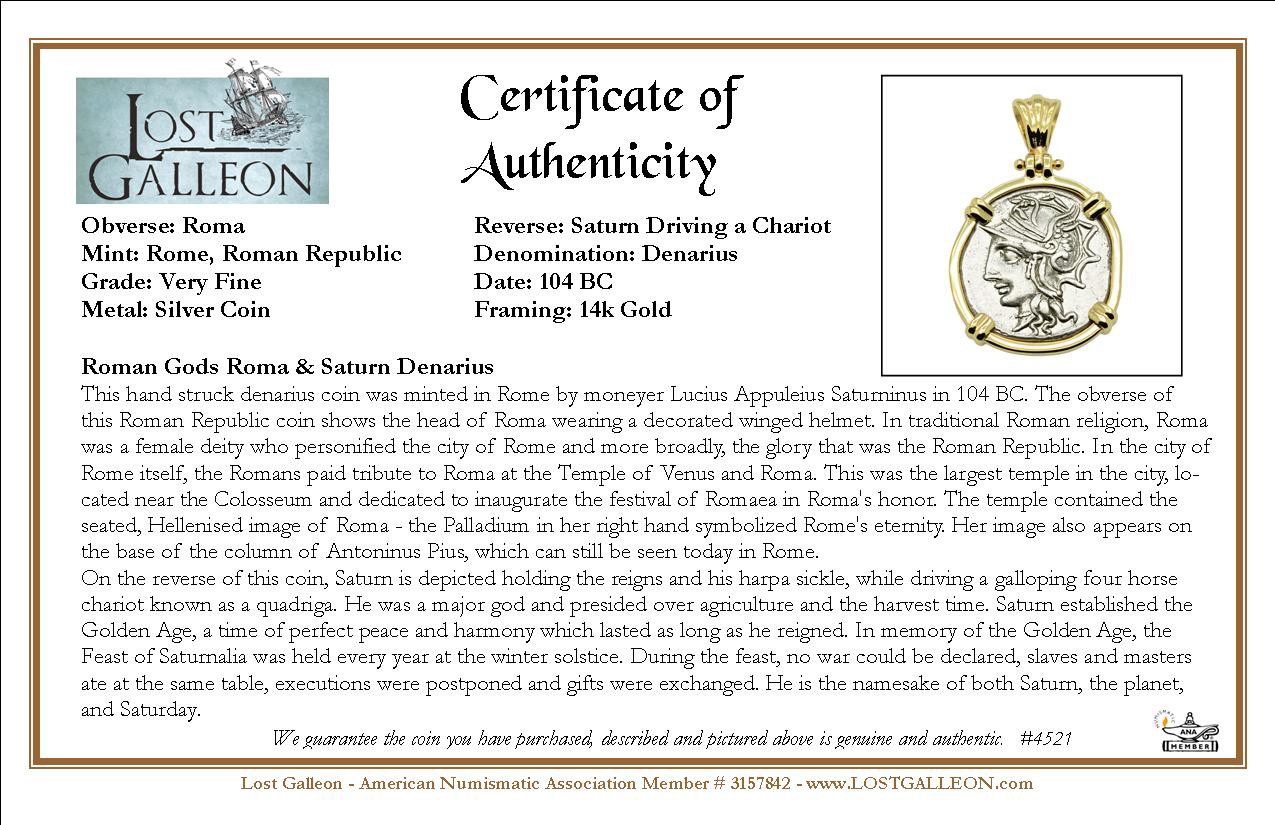 This hand struck denarius coin was minted in Rome by moneyer Lucius Appuleius Saturninus in 104 BC. The obverse of this Roman Republic coin shows the head of Roma wearing a decorated winged helmet. In traditional Roman religion, Roma was a female deity who personified the city of Rome and more broadly, the glory that was the Roman Republic. In the city of Rome itself, the Romans paid tribute to Roma at the Temple of Venus and Roma. This was the largest temple in the city, located near the Colosseum and dedicated to inaugurate the festival of Romaea in Roma's honor. The temple contained the seated, Hellenised image of Roma - the Palladium in her right hand symbolized Rome's eternity. Her image also appears on the base of the column of Antoninus Pius, which can still be seen today in Rome.