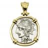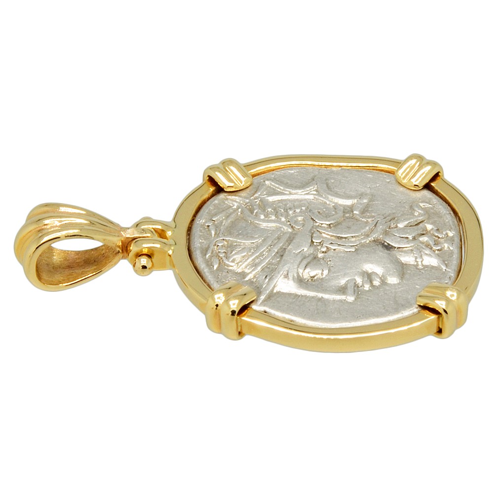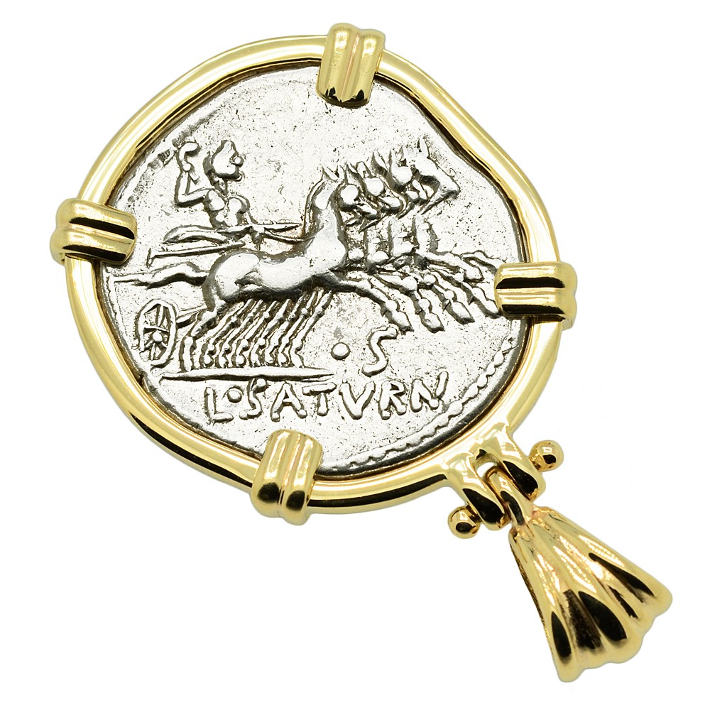 On the reverse of this coin, Saturn is depicted holding the reigns and his harpa sickle, while driving a galloping four horse chariot known as a quadriga. He was a major god and presided over agriculture and the harvest time. Saturn established the Golden Age, a time of perfect peace and harmony which lasted as long as he reigned. In memory of the Golden Age, the Feast of Saturnalia was held every year at the winter solstice. During the feast, no war could be declared, slaves and masters ate at the same table, executions were postponed and gifts were exchanged. He is the namesake of both Saturn, the planet, and Saturday.