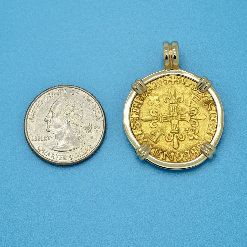 The obverse of this coin shows a Cross Fleurée with two "F" and two fleur de lis in reverse quadrants with the Latin legend translated to: “Christ overcomes, Christ reigns, Christ commands.” The Ecu d'or "Golden Shield" was the principal 16th century French gold coin, with its name coming from the shield coat of arms with the sun above, on the reverse. The shield legend translates to: “Francis, by the grace of God, King of the Franks.”