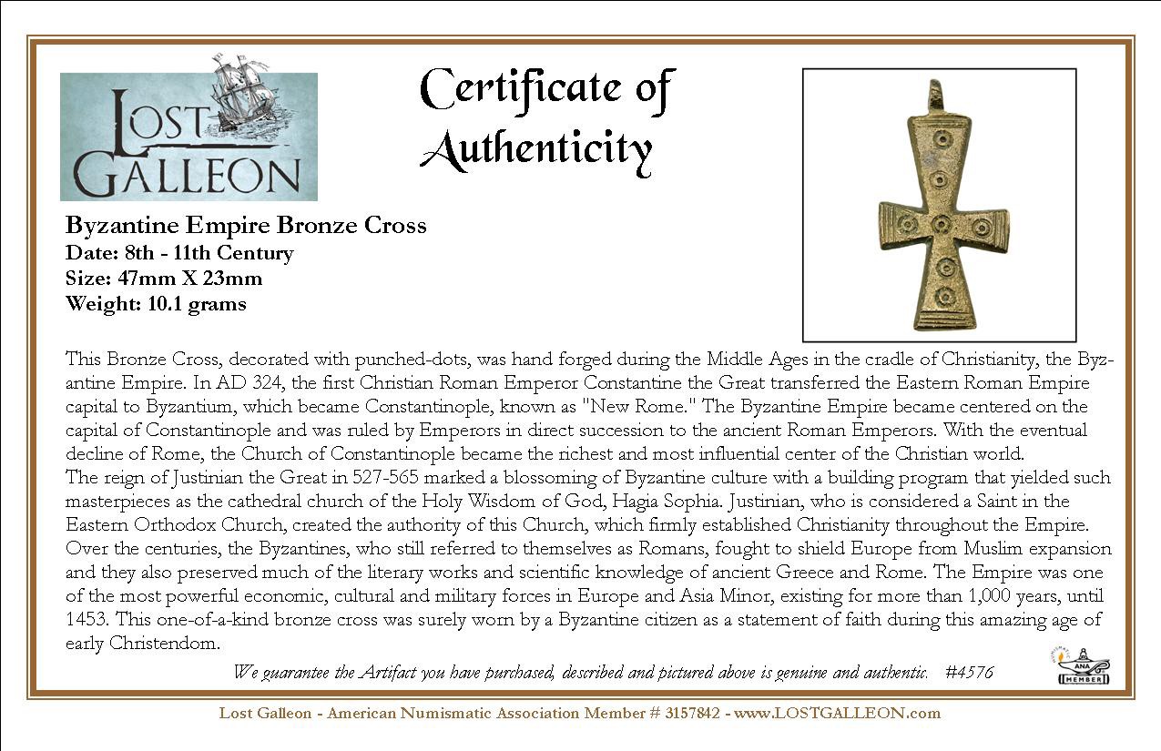 This Bronze Cross, decorated with punched-dots, was hand forged during the Middle Ages in the cradle of Christianity, the Byzantine Empire. In AD 324, the first Christian Roman Emperor Constantine the Great transferred the Eastern Roman Empire capital to Byzantium, which became Constantinople, known as "New Rome." The Byzantine Empire became centered on the capital of Constantinople and was ruled by Emperors in direct succession to the ancient Roman Emperors. With the eventual decline of Rome, the Church of Constantinople became the richest and most influential center of the Christian world.