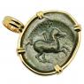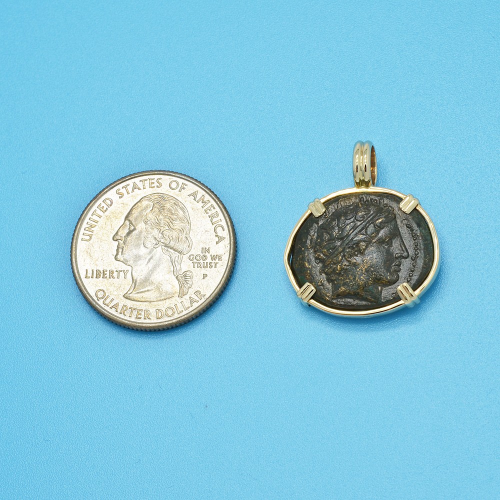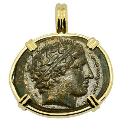 This ancient bronze coin features the head of Apollo wearing a laurel wreath. In ancient Greek mythology, Apollo was a very important Olympian deity and was also seen as the most beautiful god. He was the patron god of archers and was recognized as the god of light and the sun, truth and prophecy, music, poetry and the arts. Apollo was the son of Zeus and as the patron of Delphi, Apollo was the prophetic deity of the Delphic Oracle. Medicine and healing were also associated with Apollo and he was seen as a god who had the ability to cure. The reverse side of this coins shows a youth rider on horseback. Equestrian athletic events were popular throughout the ancient Greek world.