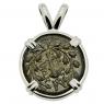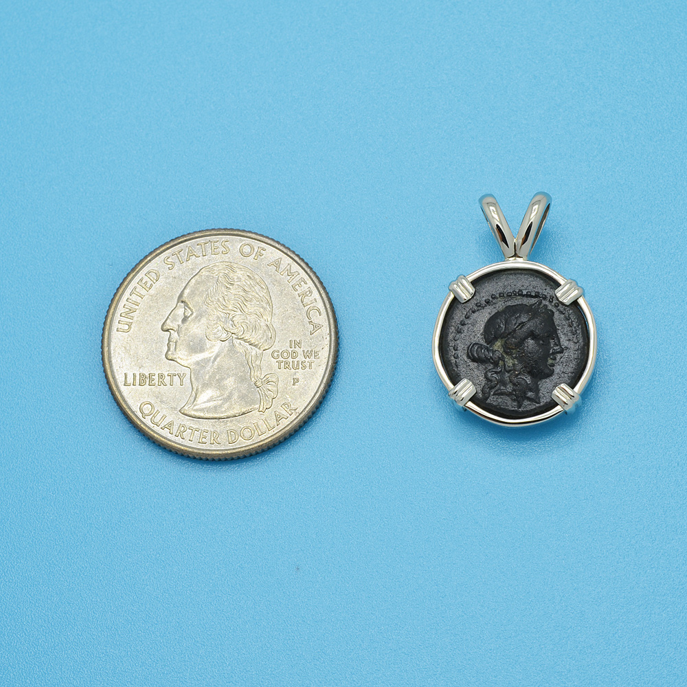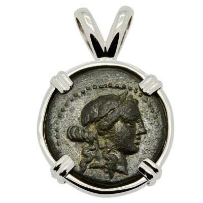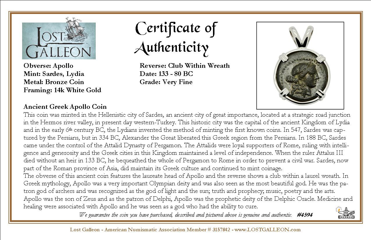 The obverse of this ancient coin features the laureate head of Apollo and the reverse shows a club within a laurel wreath. In Greek mythology, Apollo was a very important Olympian deity and was also seen as the most beautiful god. He was the patron god of archers and was recognized as the god of light and the sun; truth and prophecy; music, poetry and the arts. Apollo was the son of Zeus and as the patron of Delphi, Apollo was the prophetic deity of the Delphic Oracle. Medicine and healing were associated with Apollo and he was seen as a god who had the ability to cure.
