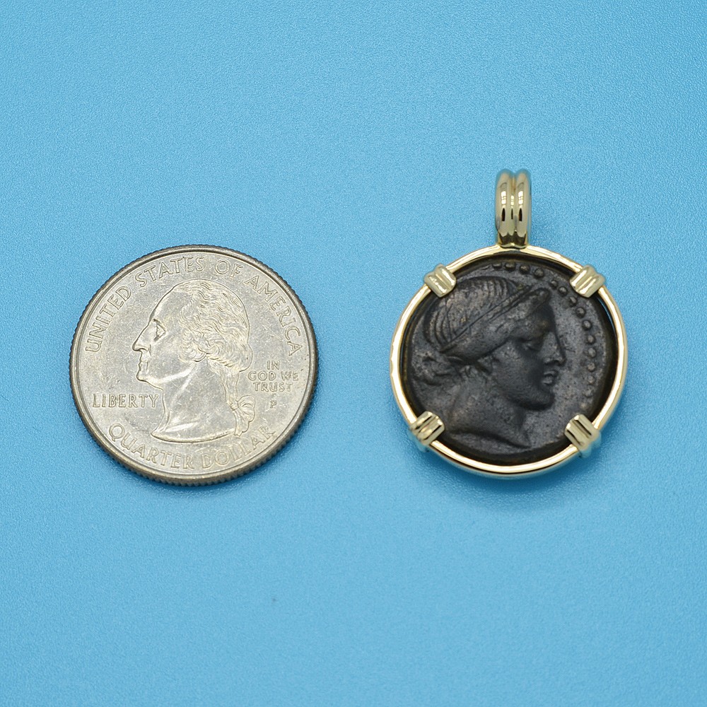 The obverse side of this ancient bronze coin features the head of the Amazon warrior Kyme. The reverse side shows a horse with its foreleg raised above an oinochoe, which was a one-handled deep wine jug. The city and surrounding countryside were well-known for their outstanding horses, which they proudly displayed on their coinage.