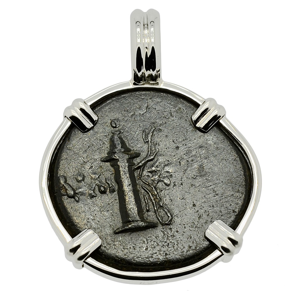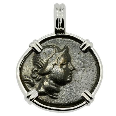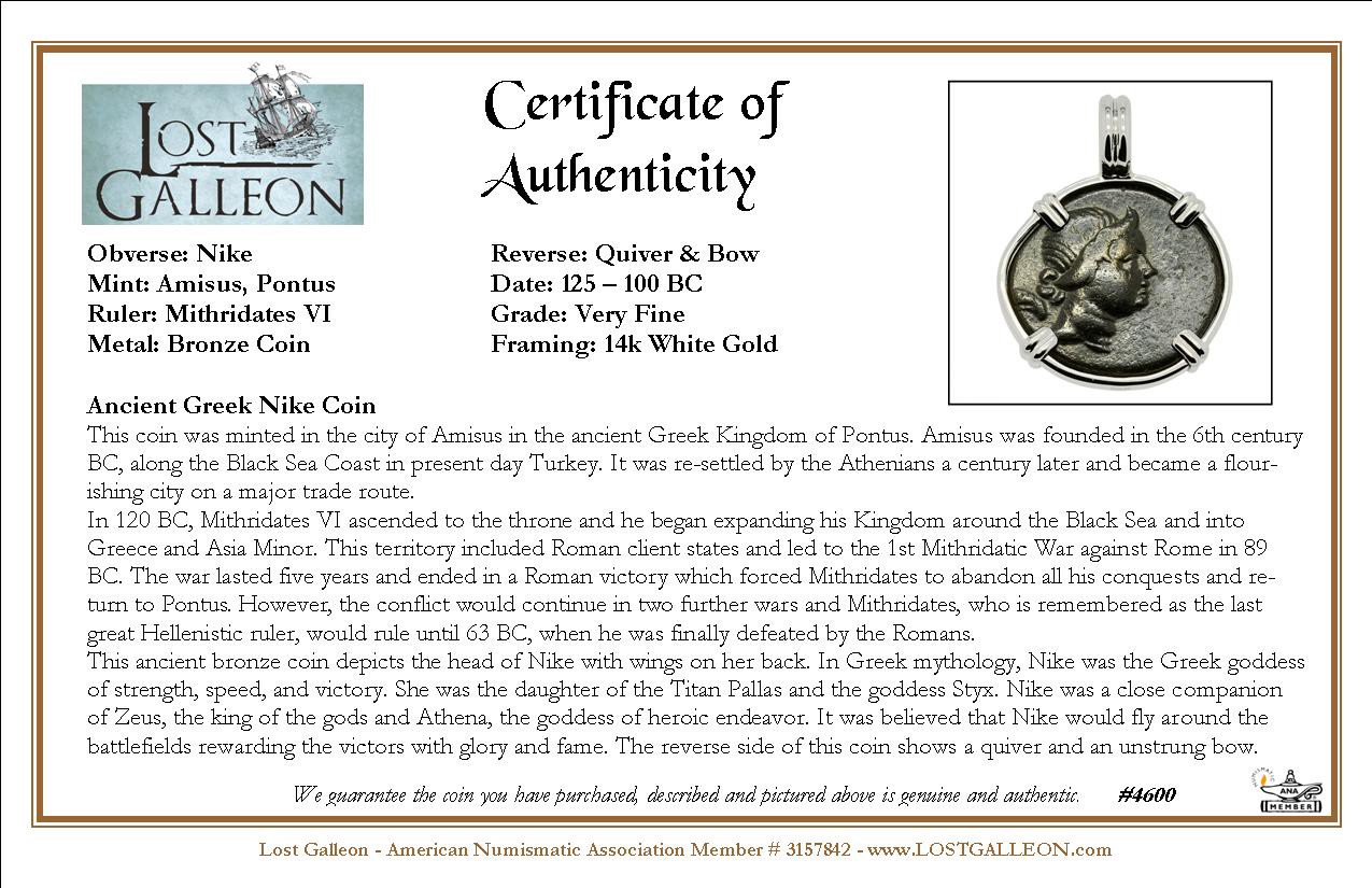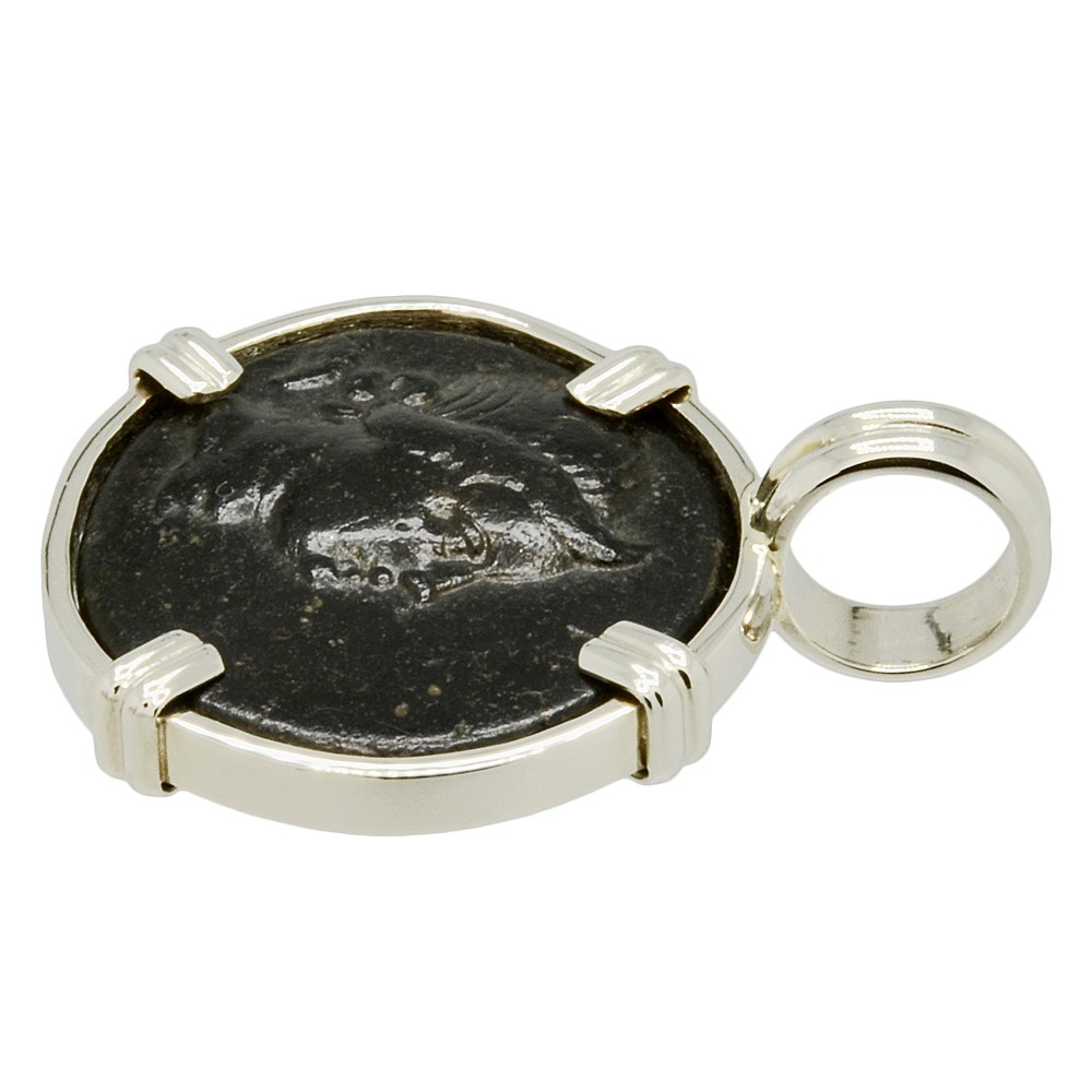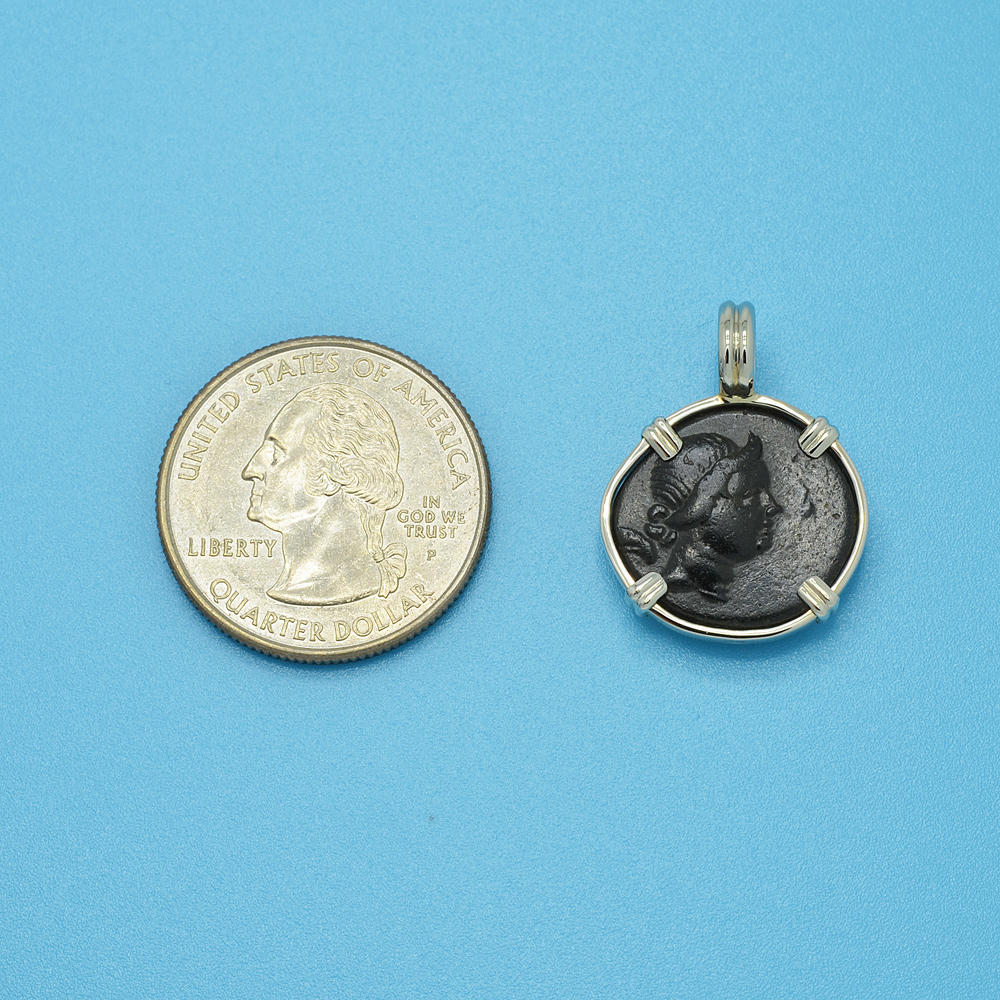This ancient bronze coin depicts the head of Nike with wings on her back. In Greek mythology, Nike was the Greek goddess of strength, speed, and victory. She was the daughter of the Titan Pallas and the goddess Styx. Nike was a close companion of Zeus, the king of the gods and Athena, the goddess of heroic endeavor. It was believed that Nike would fly around the battlefields rewarding the victors with glory and fame. The reverse side of this coin shows a quiver and an unstrung bow.