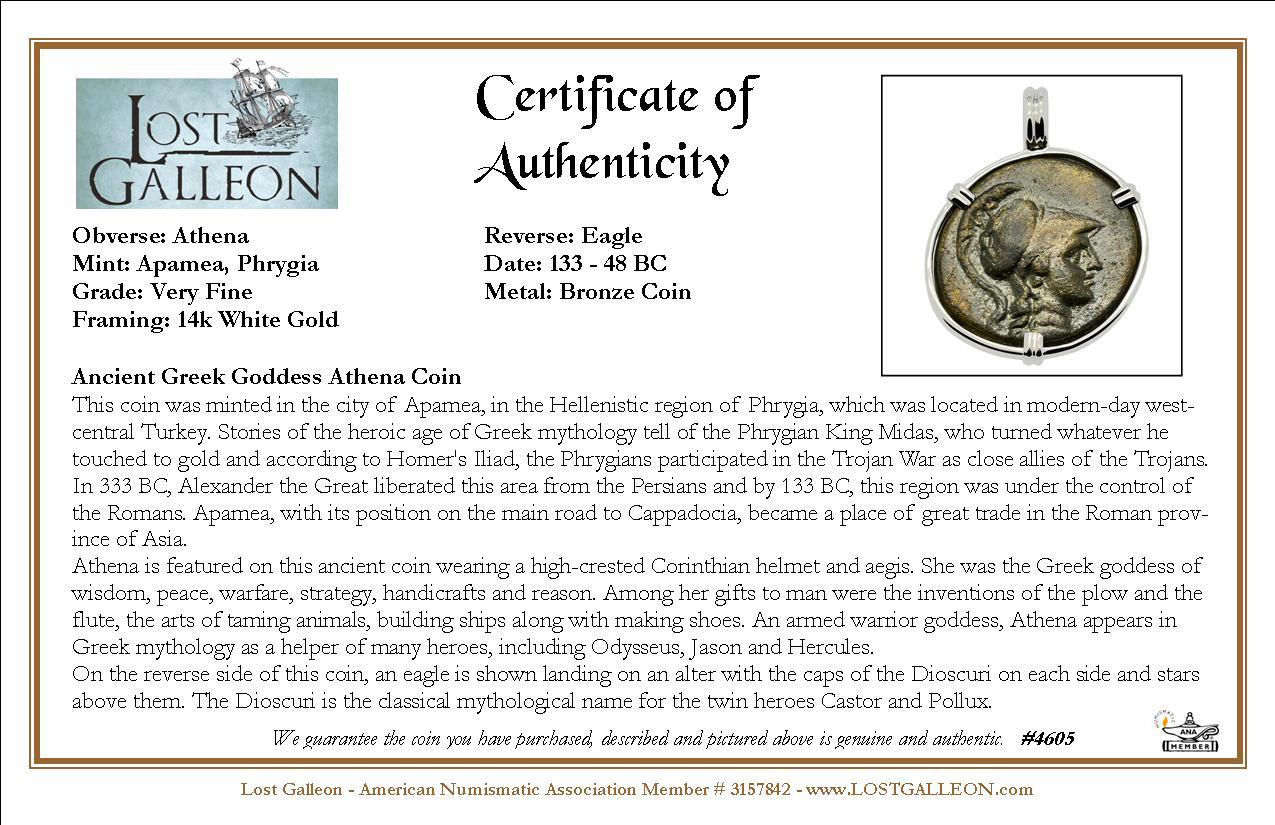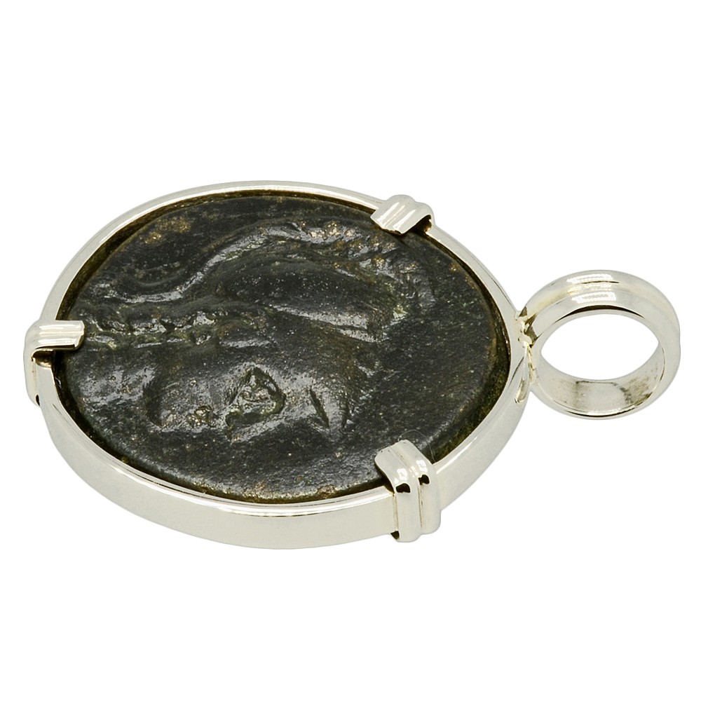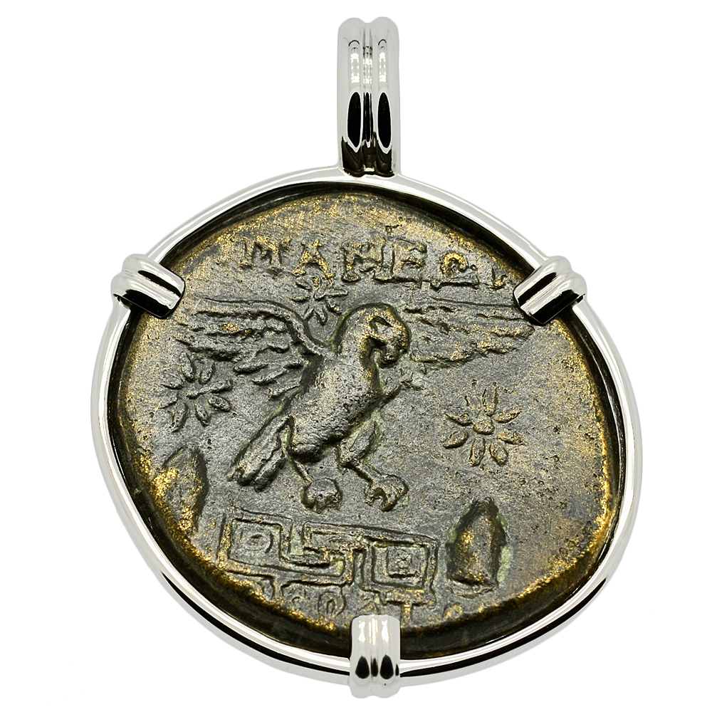 Athena is featured on this ancient coin wearing a high-crested Corinthian helmet and aegis. She was the Greek goddess of wisdom, peace, warfare, strategy, handicrafts and reason. Among her gifts to man were the inventions of the plow and the flute, the arts of taming animals, building ships along with making shoes. An armed warrior goddess, Athena appears in Greek mythology as a helper of many heroes, including Odysseus, Jason and Hercules.