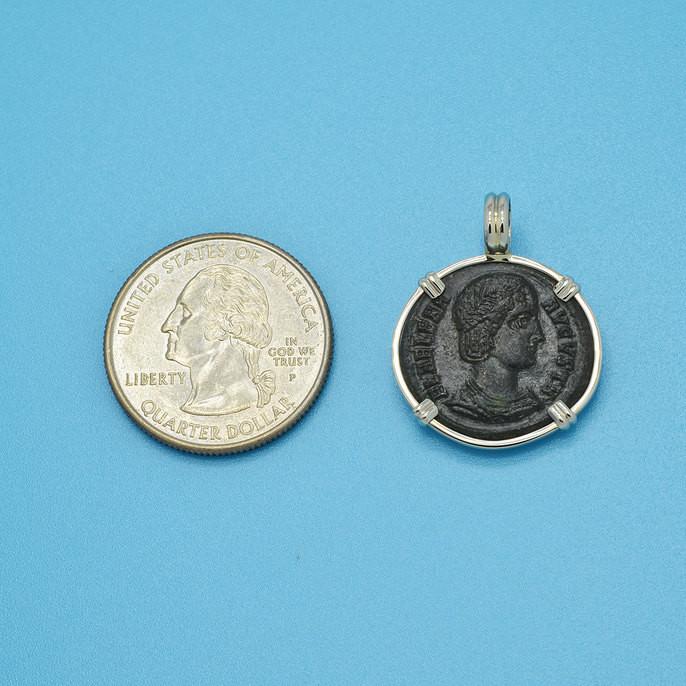 This coin was minted during the rule of Constantine the Great in the city of Heraclea, which is located in the modern-day European region of Turkey. His mother Saint Helena is shown on the obverse side and Securitas, the Roman goddess of security and stability, is shown on the reverse holding an olive branch. Helena was from the Greek city of Drepana in Asia Minor. She became the wife of the future Roman Emperor Constantius and gave birth to Constantine I in AD 272.