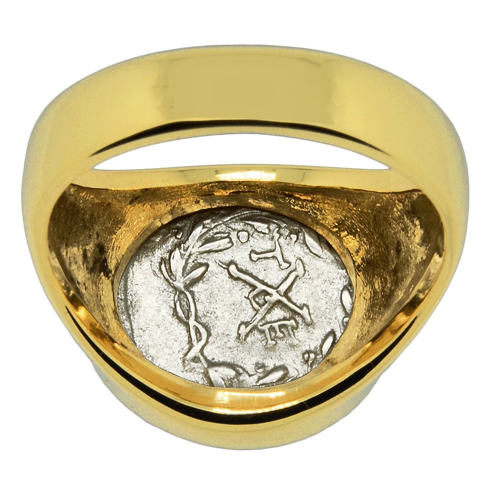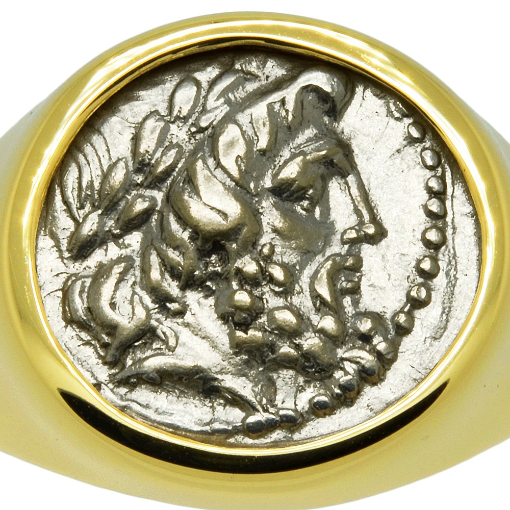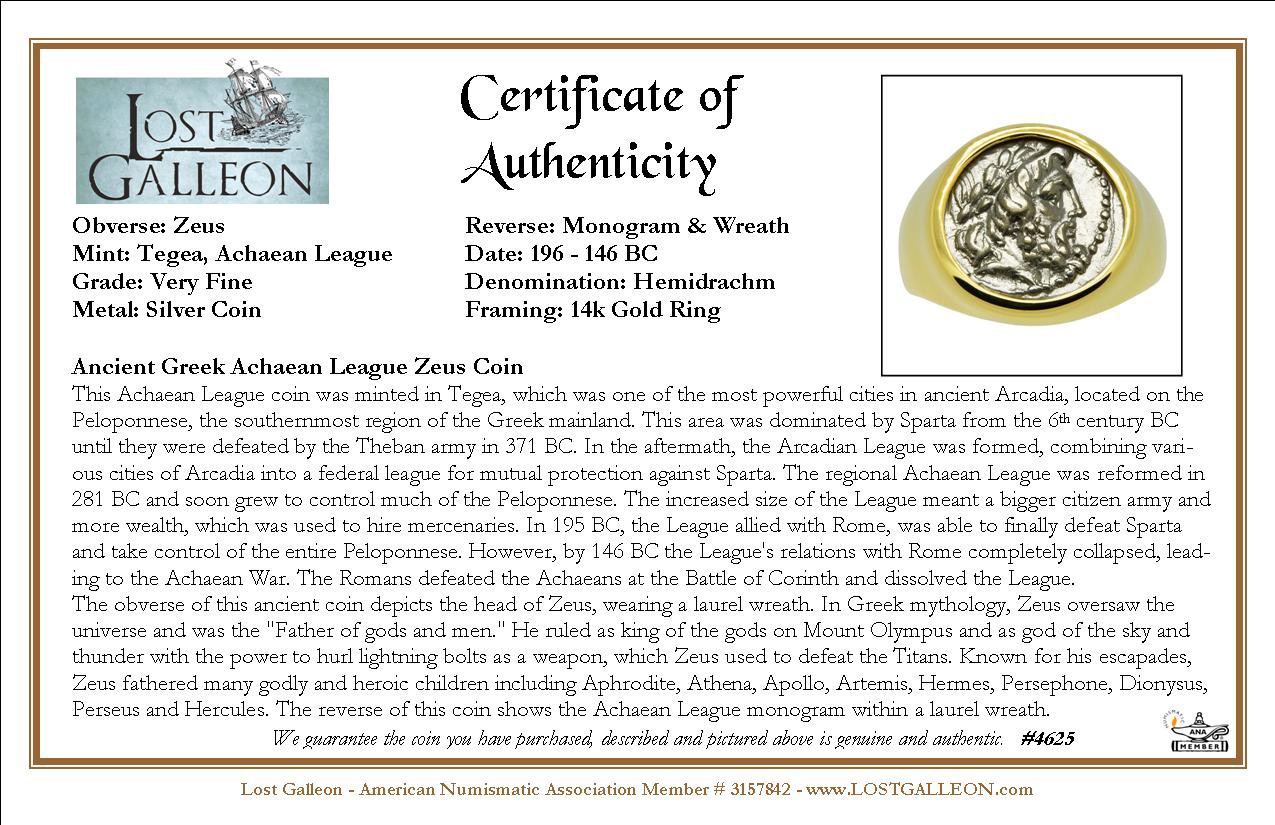 The obverse of this ancient coin depicts the head of Zeus, wearing a laurel wreath. In Greek mythology, Zeus oversaw the universe and was the "Father of gods and men." He ruled as king of the gods on Mount Olympus and as god of the sky and thunder with the power to hurl lightning bolts as a weapon, which Zeus used to defeat the Titans. Known for his escapades, Zeus fathered many godly and heroic children including Aphrodite, Athena, Apollo, Artemis, Hermes, Persephone, Dionysus, Perseus and Hercules. The reverse of this coin shows the Achaean League monogram within a laurel wreath.