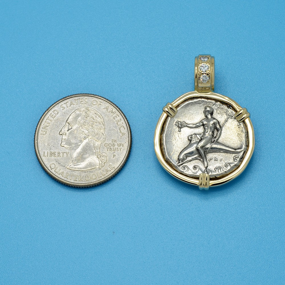 The obverse of this ancient silver coin features the boy Taras riding on a dolphins back over waves, while he is holding a trident with his left hand and a kantharos cup in his right hand. This is very similar to the image that is depicted on the modern city emblem today. The reverse side shows a nude youth on horseback prancing to the right, while he is crowning his horse with a wreath. Nike, the goddess of Victory is crowning the youth with a wreath. The city of Taras was well known for the many equestrian athletic events held there.