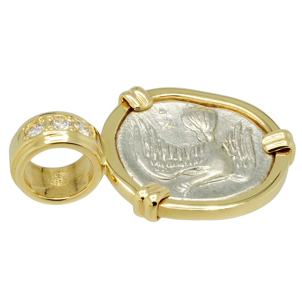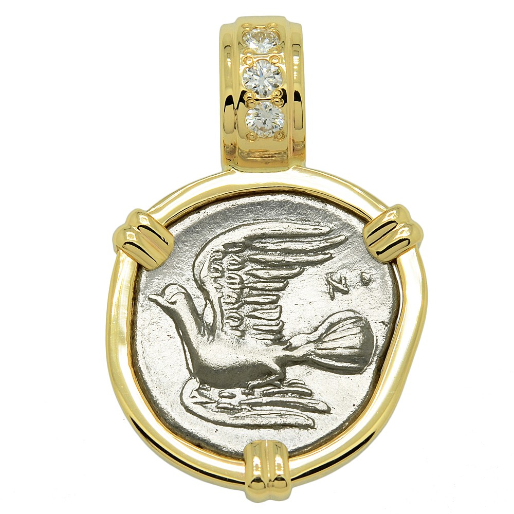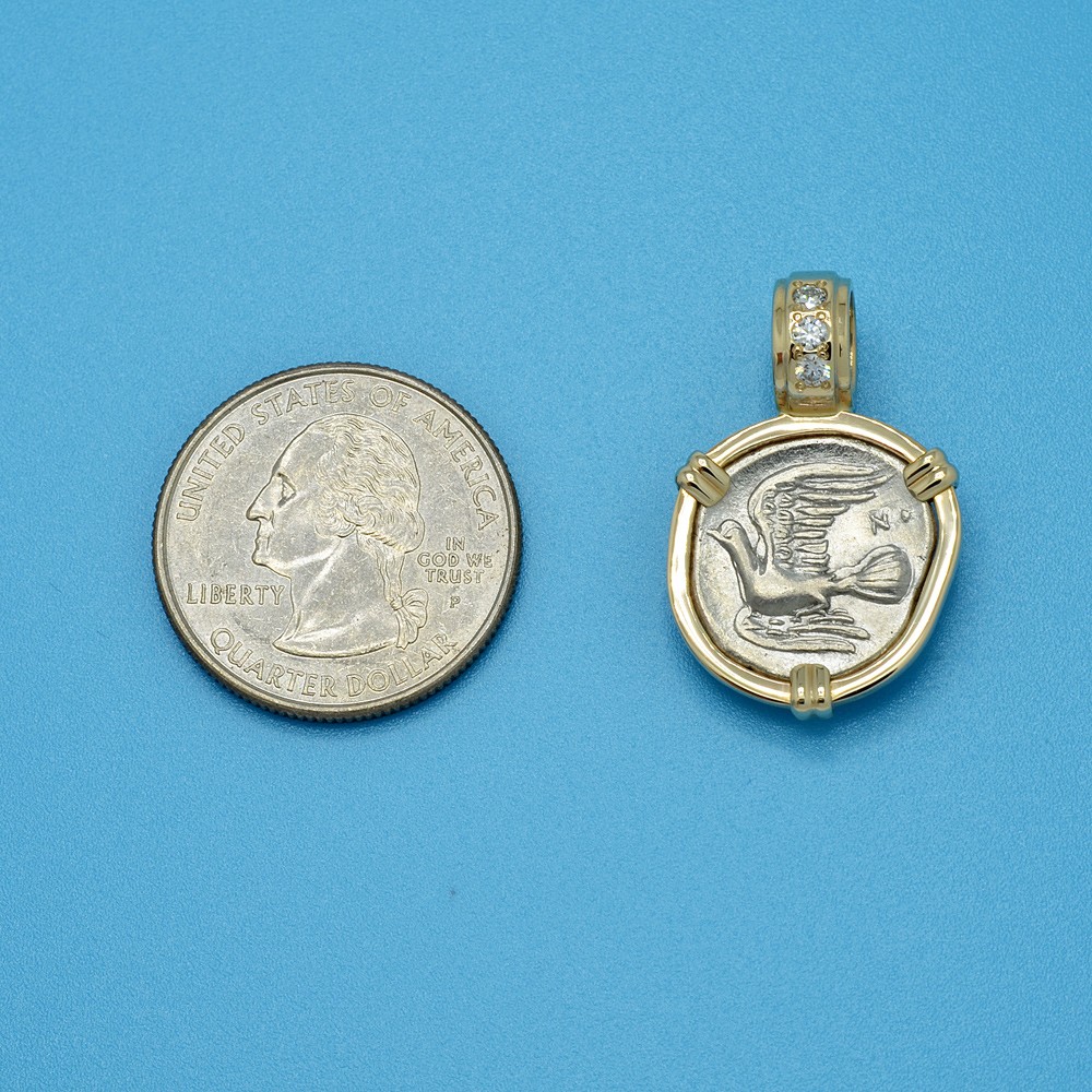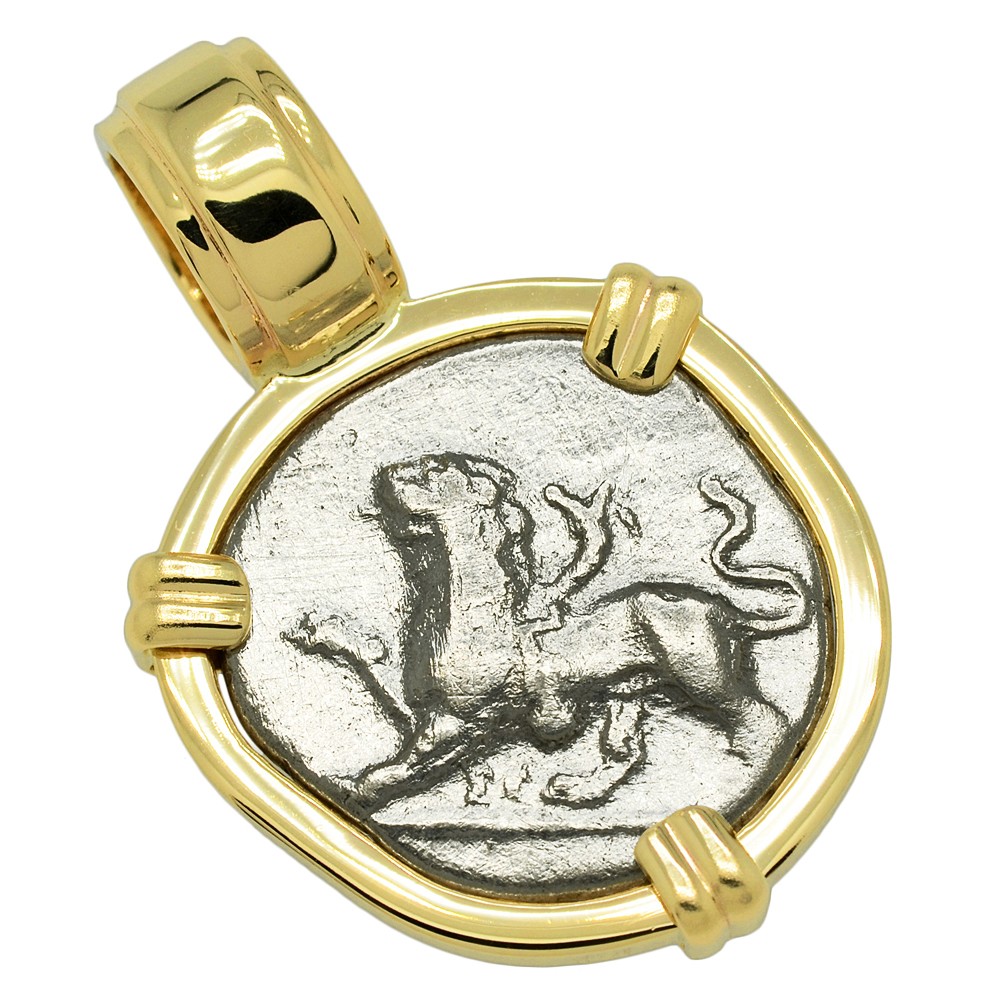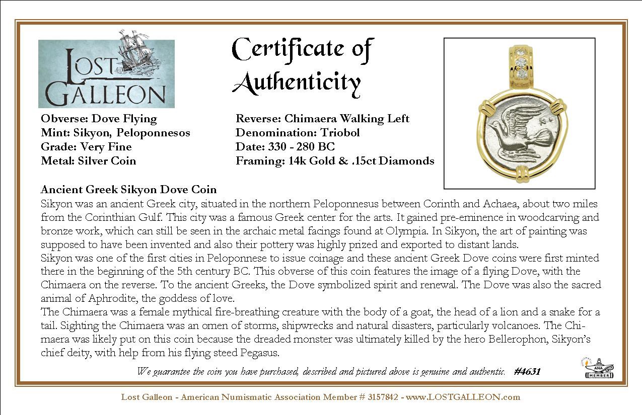 Sikyon was one of the first cities in Peloponnese to issue coinage and these ancient Greek Dove coins were first minted there in the beginning of the 5th century BC. This obverse of this coin features the image of a flying Dove, with the Chimaera on the reverse. To the ancient Greeks, the Dove symbolized spirit and renewal. The Dove was also the sacred animal of Aphrodite, the goddess of love.